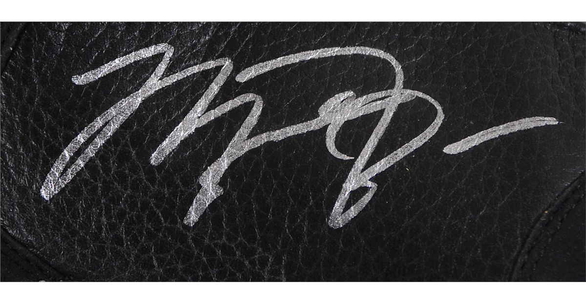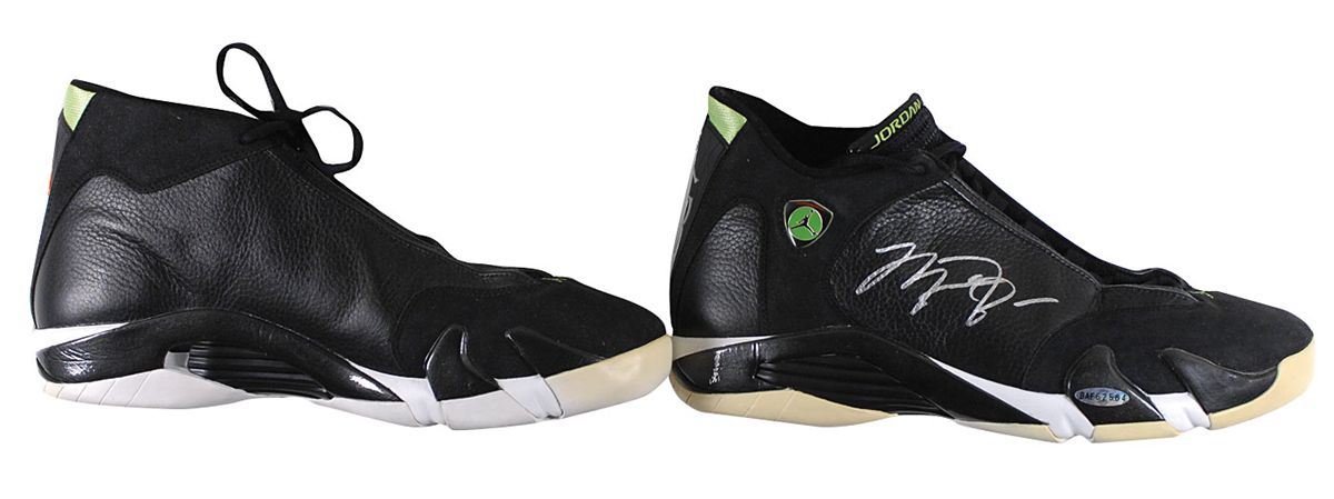 Pair of Nike Air Jordan XIV basketball sneakers, size 13, signed in silver ink on the side of the right shoe. In fine condition, with an Upper Deck hologram affixed to lower right. Accompanied by a certificate of authenticity from Upper Deck.