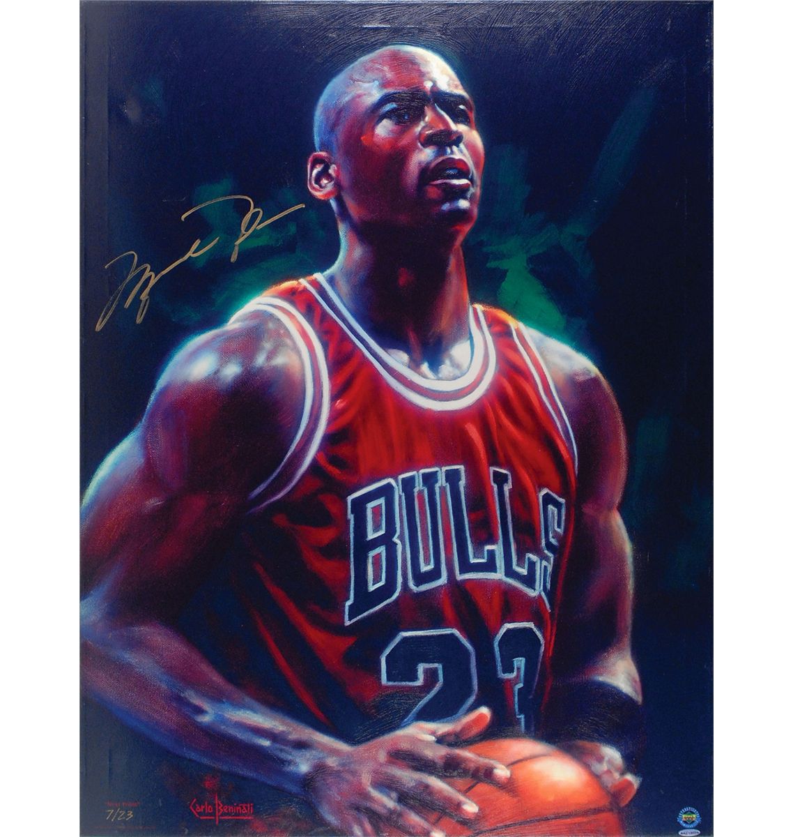 Attractive color limited edition giclee print on canvas, entitled ‘Next Point,’ numbered 7/23, showing Jordan preparing to take a free throw, stretched across a 30 x 39.5 wooden frame, nicely signed in gold ink by Jordan. In fine condition, with an Upper Deck hologram affixed to lower right corner. Jordan’s signature measures almost 11.5? long.