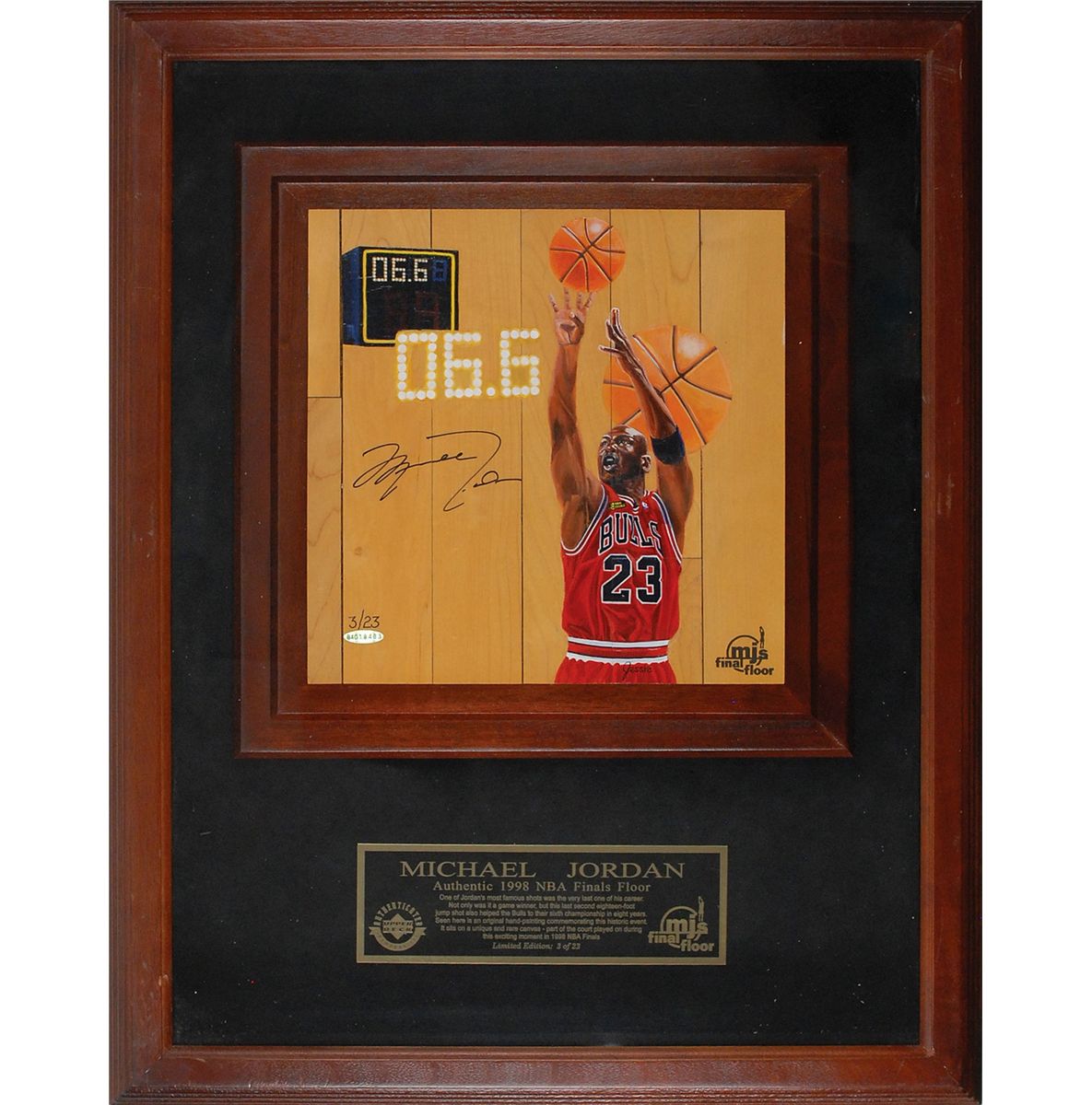Limited edition 11.75 x 11.75 section of flooring taken from the court of Jordan’s final game in the 1998 NBA Finals, numbered 3/23, bearing an original painted portrait of Jordan hitting the game-winning shot, signed in black felt tip by Jordan, and also signed by the artist. Flooring is shadow-boxed and framed with a descriptive plaque to an overall size of 22 x 28 x 4.5. In very fine condition. Accompanied by a certificate of authenticity from Upper Deck. Oversized.