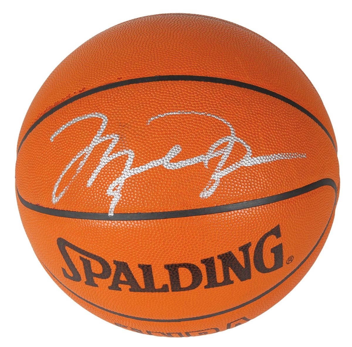 Official Spalding NBA Game Ball basketball signed above the logos in silver ink by Jordan. In fine condition, with an Upper Deck label affixed to the side (certificate not present).