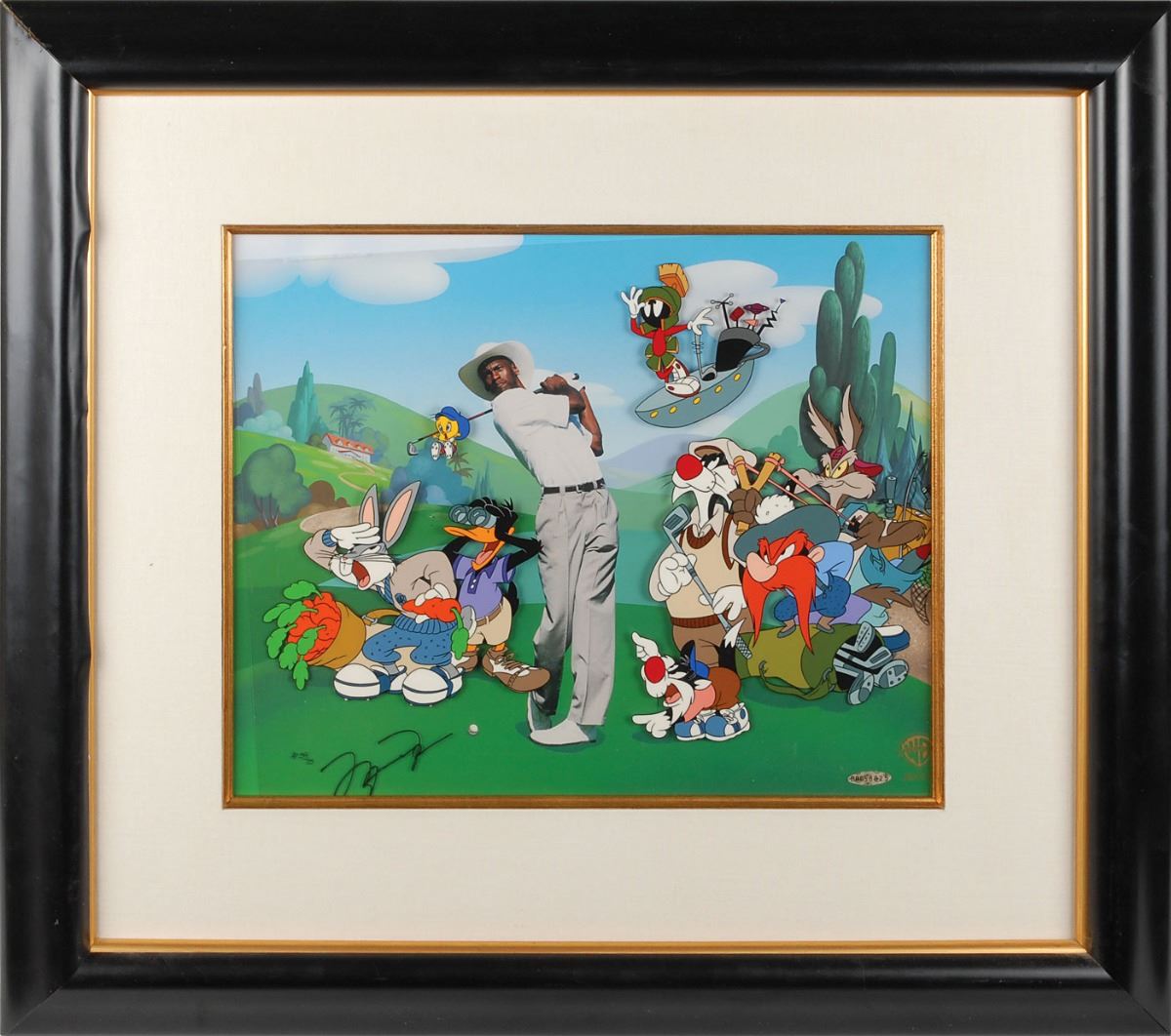 Limited edition Warner Bros. animation cel of several Looney Tunes cartoon characters watching Michael Jordan on the golf course, 16.25 x 13, numbered 59/75, depicting Bugs, Daffy, Yosemite Sam, Marvin the Martian, Sylvester and Sylvester, Jr., Tweety, and Wile E. Coyote, signed in the lower left corner in black felt tip by Jordan. The cel is placed on a matching production background of Jordan and the idyllic course. Cloth-matted and framed to an overall size of 27.5 x 24.25. In fine condition. Oversized.