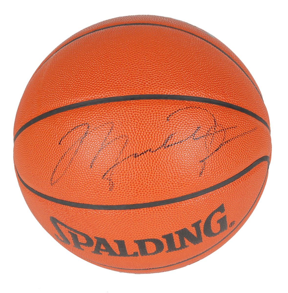 Official Spalding NBA basketball prominently signed in black felt tip on a side panel by Jordan. In fine condition. Accompanied by a letter from a photographer stating that he obtained this signature in person while conducting a photo shoot for Upper Deck.