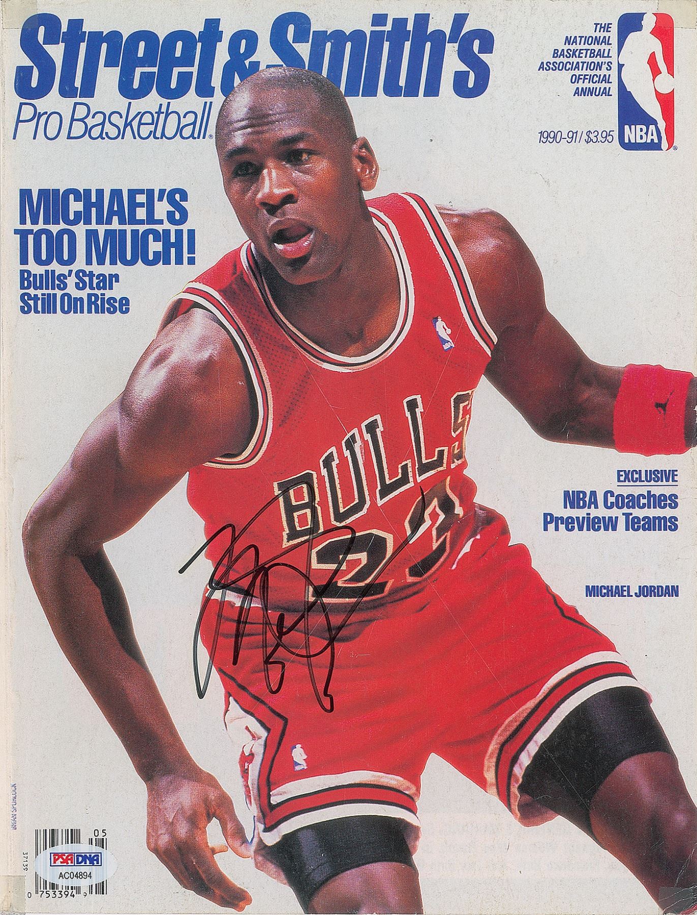 Street & Smith's Pro Basketball magazine cover from 1990-1991, measures 8.25 x 10.75, signed in black felt tip by Jordan. In fine condition, with a small piece of clear tape to each corner. Accompanied by a full letter of authenticity from PSA/DNA.