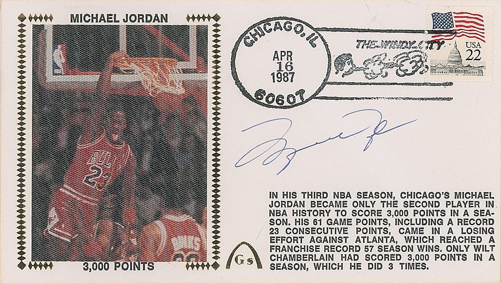 Gateway cover with a silk cachet honoring the Chicago Bulls superstar's 3,000 point season in 1987, signed in blue ballpoint by Michael Jordan. In very fine condition.