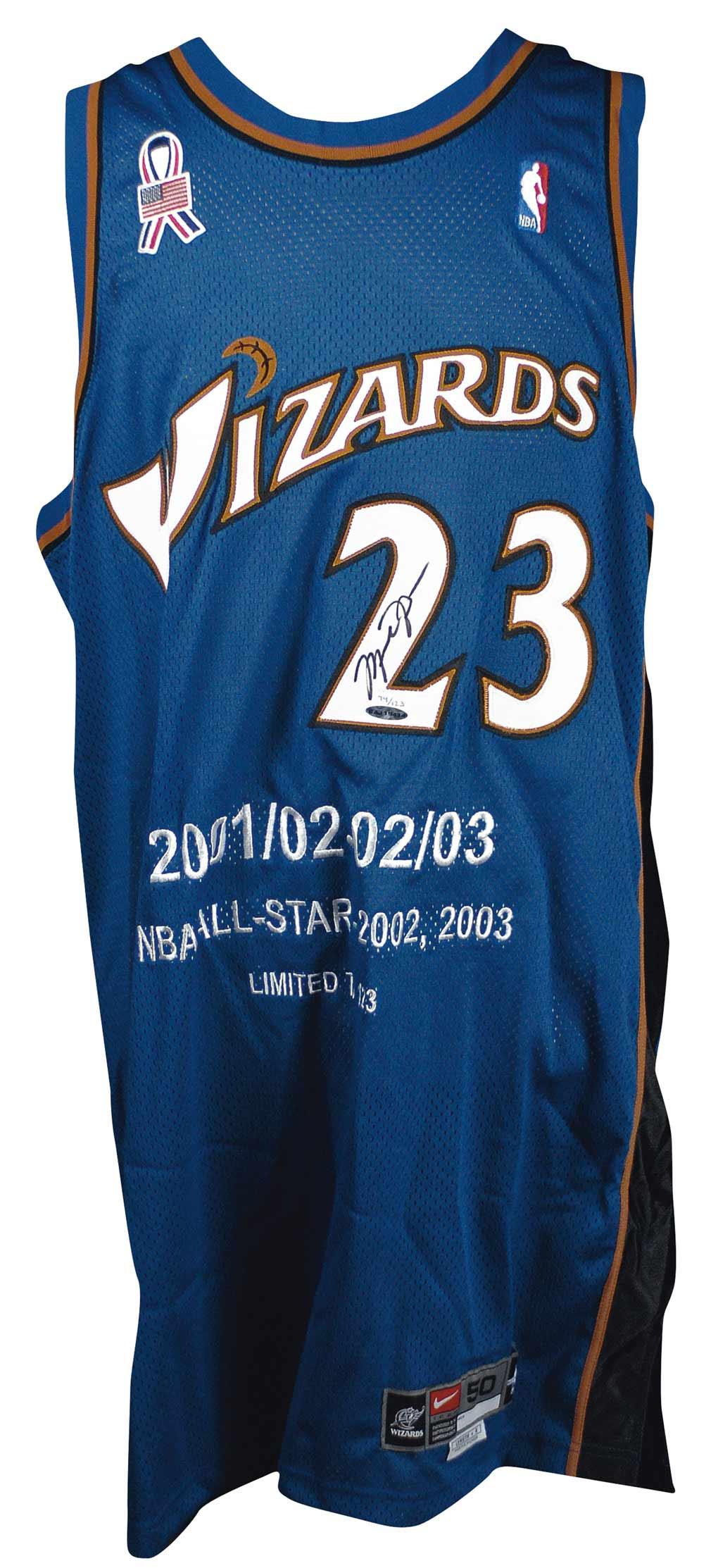 Official limited edition Nike replica Washington Wizards basketball jersey, #74/123, with sewn on letters and numbers, signed in felt tip on the number on the front. Front of jersey also bears embroidered information of Jordan’s accomplishments as a member of the Wizards. Accompanied by a certificate of authenticity from Upper Deck. In very fine condition. Vibrantly colored making for an impressive display piece.
