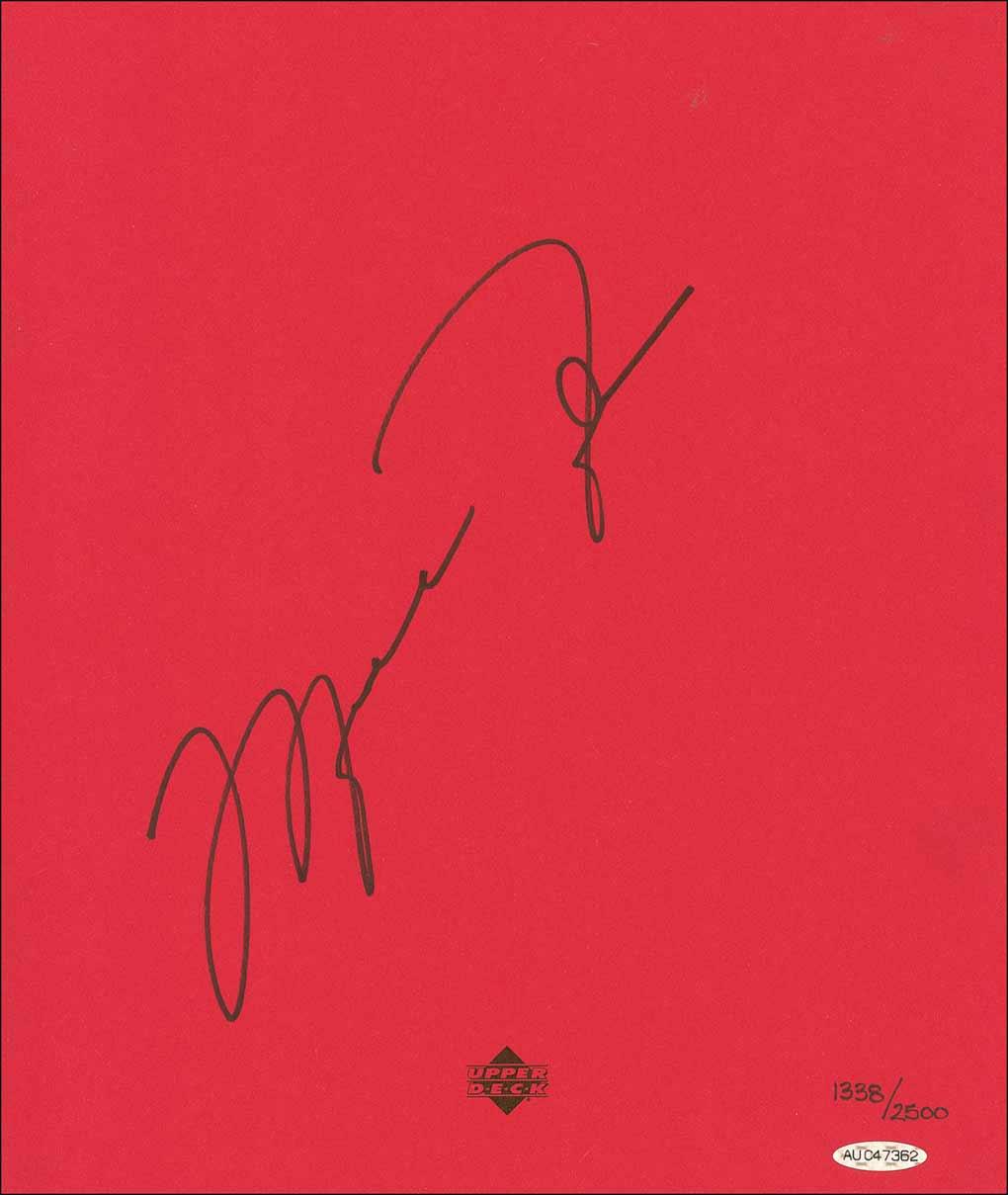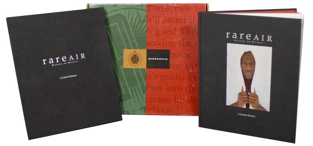 Limited edition signed book: Rare Air: Michael on Michael. First edition, later printing. San Francisco: Collins, 1993. Hardcover with slipcase, 11.23 x 13.25, 112 pages, #1338/2500. Signed in black felt tip on the first free end page. Accompanied by its original Upper Deck box. In fine condition, with an Upper Deck hologram affixed to bottom of signed page, and a bit of trivial wear to cover. The slipcase also rates fine, with some scattered light surface wear.