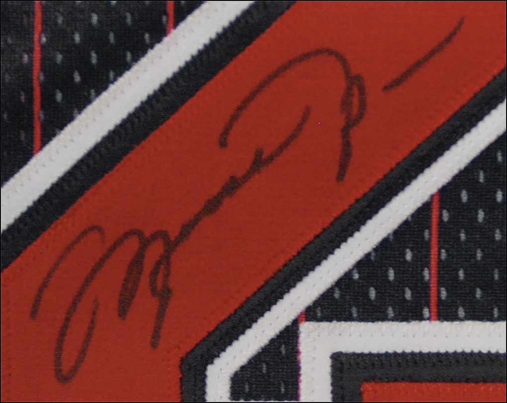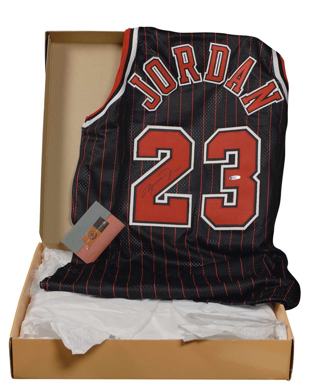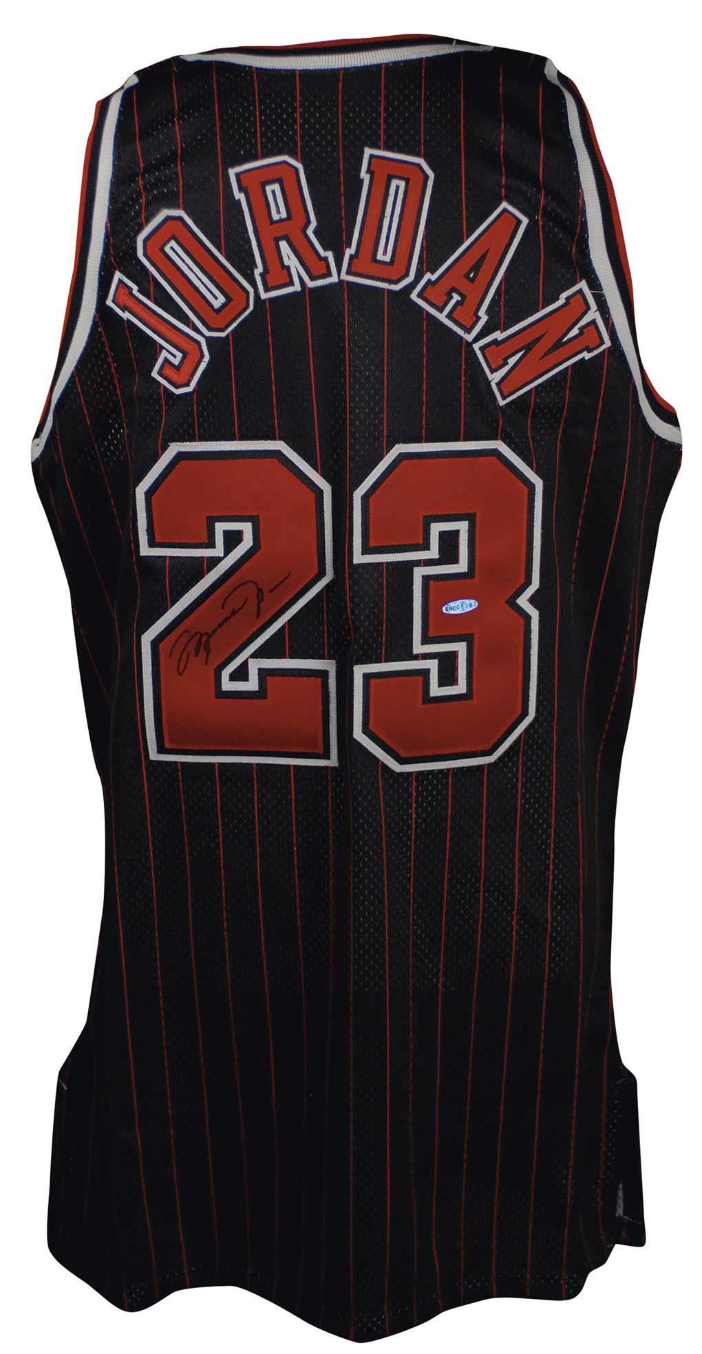 Official Champion replica Chicago Bulls alternate black basketball jersey, with sewn on letters and numbers, signed in black felt tip on the number on the back. Accompanied by a certificate of authenticity from Upper Deck, as well as its original box. In very fine condition.