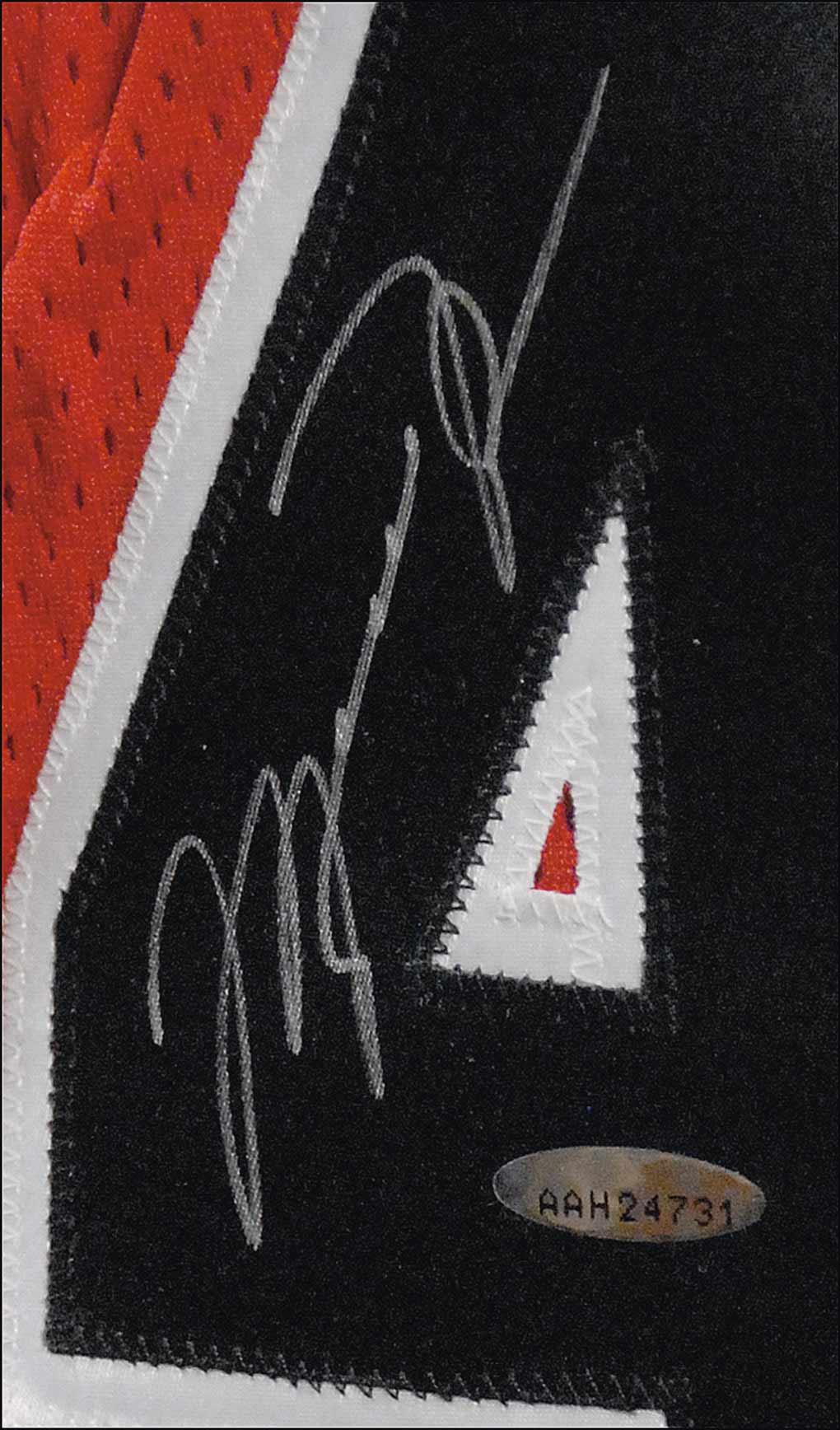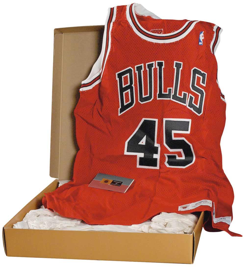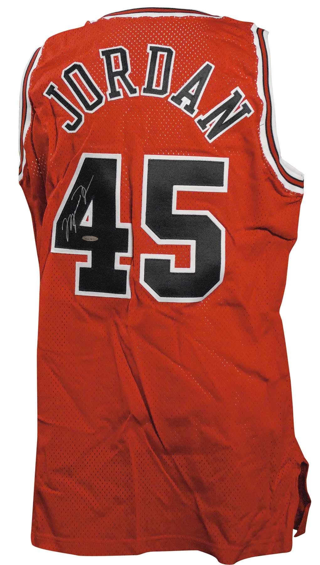 Official Champion Chicago Bulls #45 basketball jersey, with sewn on letters and numbers, signed in silver ink on the number on the back. Accompanied by a certificate of authenticity from Upper Deck, as well as its original box. In very fine condition.