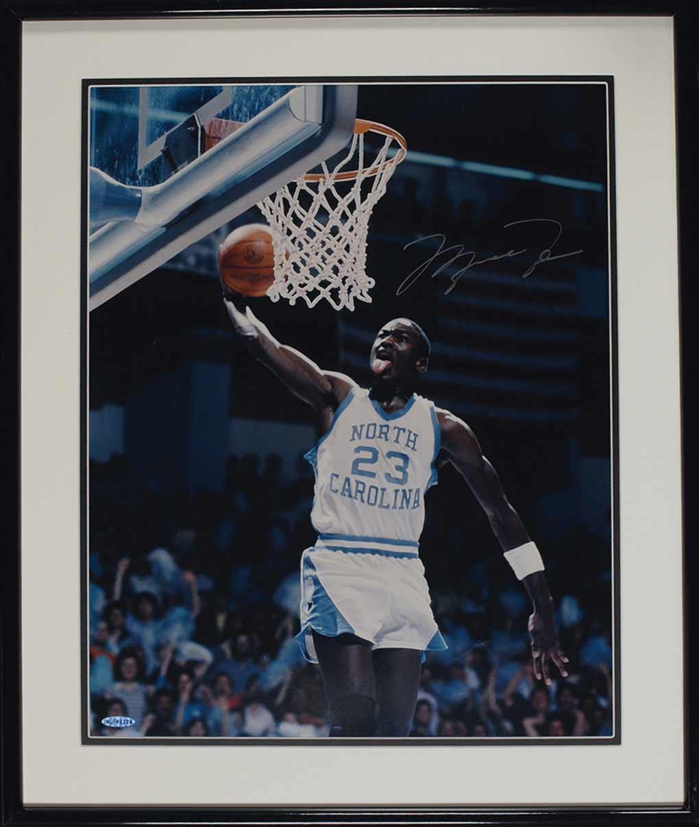 Color satin-finish 16 x 20 photo of Jordan dunking the ball for North Carolina, signed in silver ink. Double matted and framed to an overall size of 21 x 25. Accompanied by a certificate of authenticity from Upper Deck. In very fine condition. Oversized.