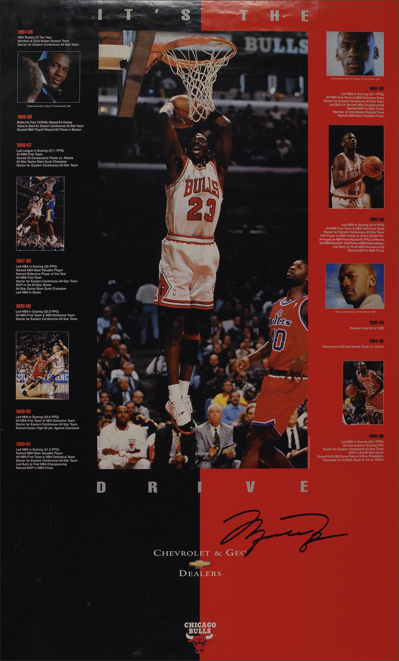 Color 22 x 37 Chevrolet promotional poster highlighting Jordan’s career with the Bulls, signed in black felt tip. Rolled and in fine condition. Pre-certified Steve Grad/PSA/DNA and RRAuction COA.