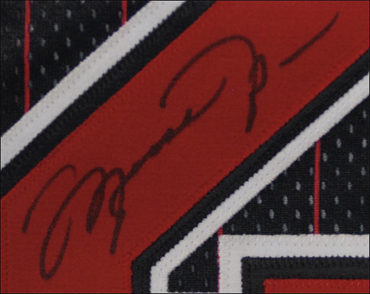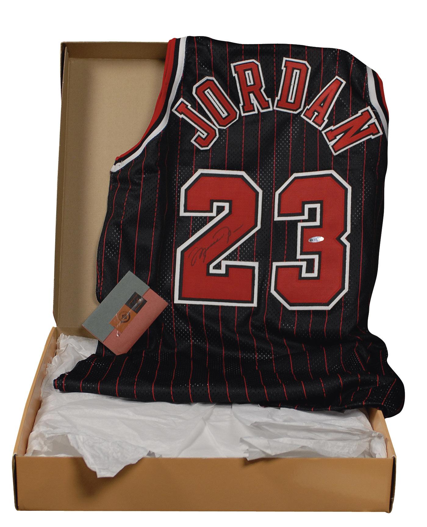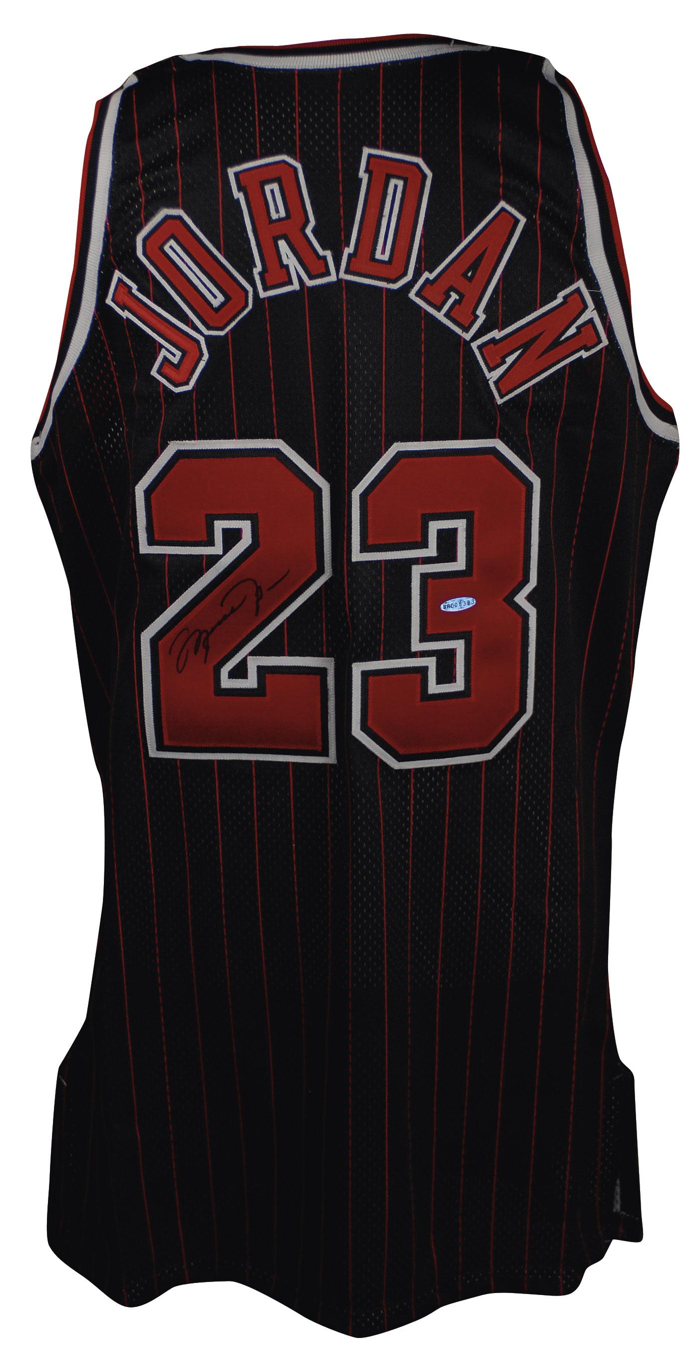 Official Champion replica Chicago Bulls alternate black basketball jersey, with sewn on letters and numbers, signed in black felt tip on the number on the back. Accompanied by a certificate of authenticity from Upper Deck, as well as its original box. In very fine condition. Pre-certified Steve Grad/PSA/DNA and RRAuction COA.