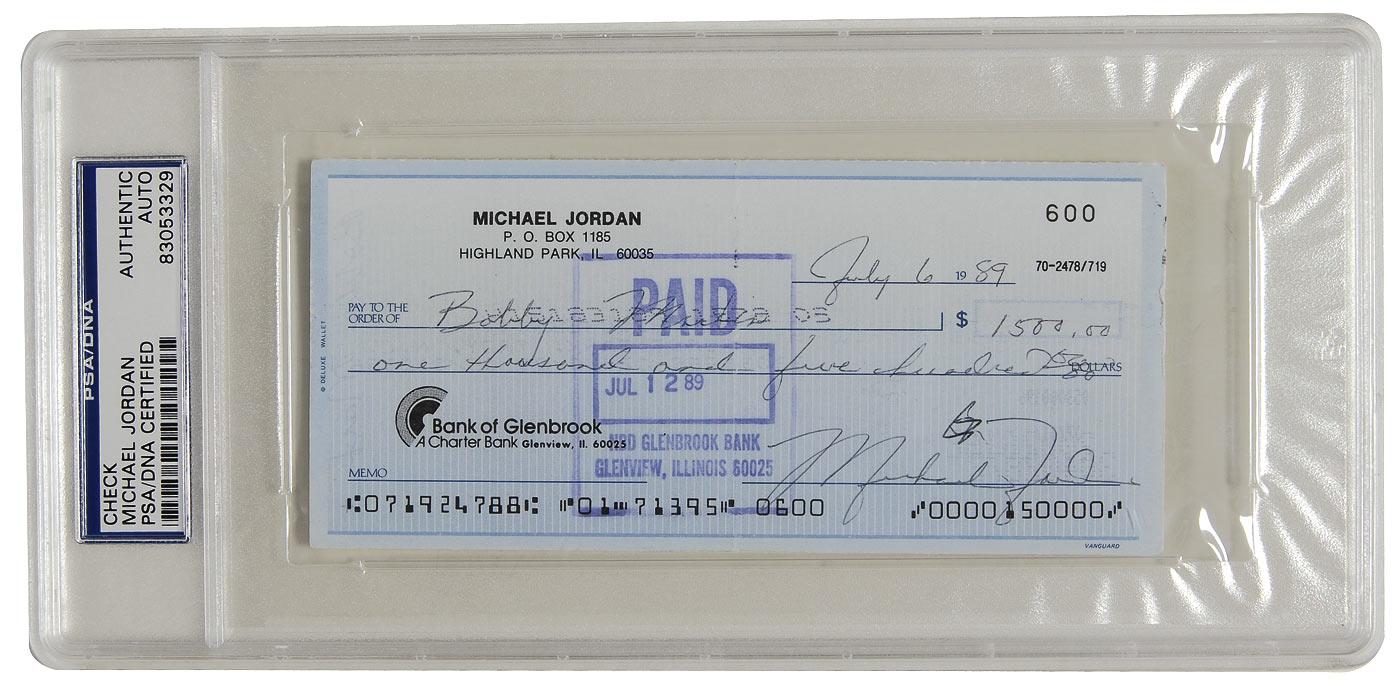 Personal check, 6 x 2.75, filled out and signed by Jordan, payable to Bobby Martin for $1,500.00, July 6, 1989. Encapsulated in a plastic PSA/DNA authentication holder. In fine condition, with expected cancellation stamps just touching the “M” in “Michael.” RRAuction COA.
