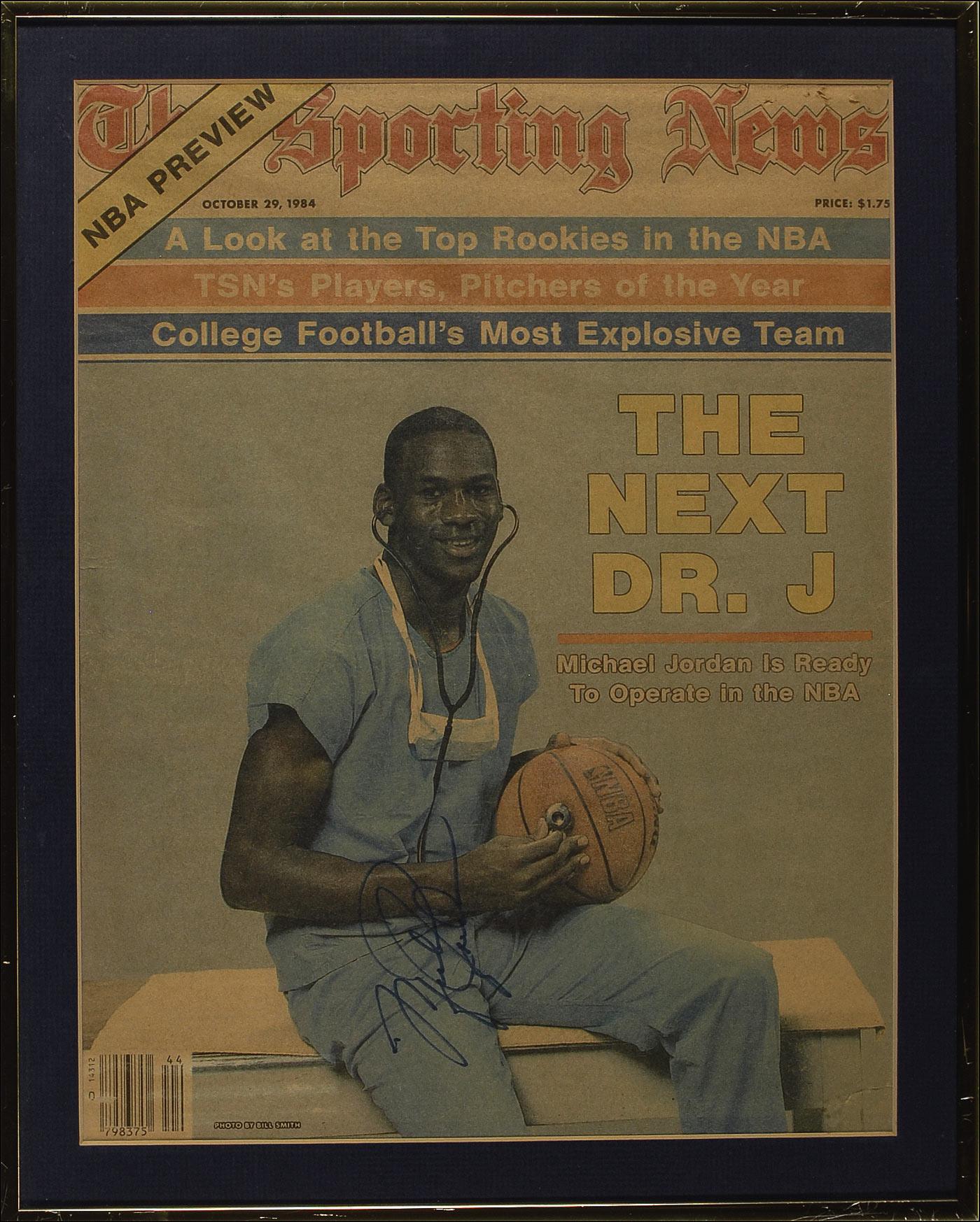 Sporting News cover, dated October 29, 1984, featuring Jordan in surgical garb, and the headline proclaiming him the “Next Dr. J.,” signed in blue felt tip by Jordan. Matted and framed to an overall size of 12.25 x 15.25. In fine condition, with mild overall toning.