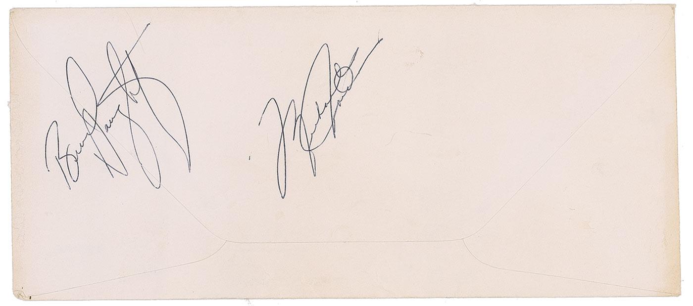 Early black ballpoint signature, “Michael Jordan,” on the back of a white 9.5 x 4.25 envelope for the Triangle Travel Agency in Durham, North Carolina. Also signed by Brad Daughterty. Light handling wear and some faint toning to the edges, otherwise fine condition. Jordan’s signature could be easily matted for display. Accompanied by a letter from the original recipient stating that he was in a gym in 1986 when he encountered Jordan and Daughterty, both University of North Carolina alumni, and approached them for their autographs.
