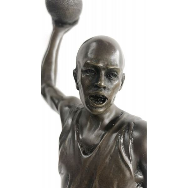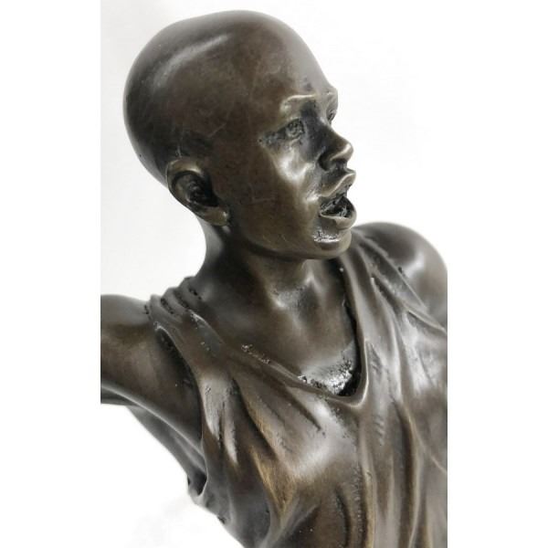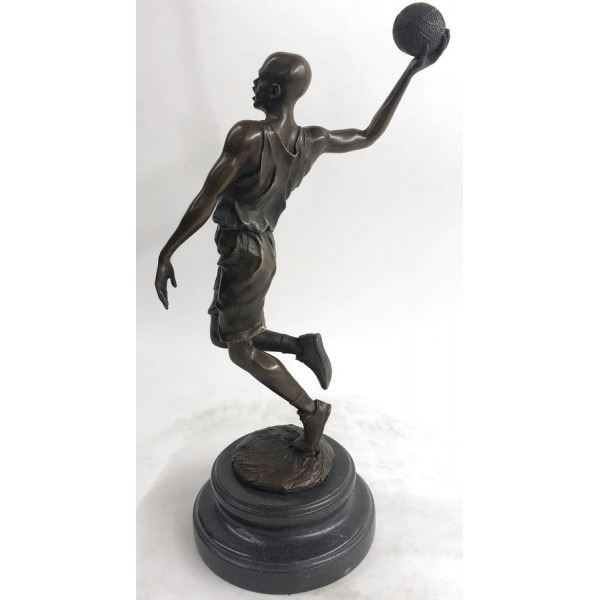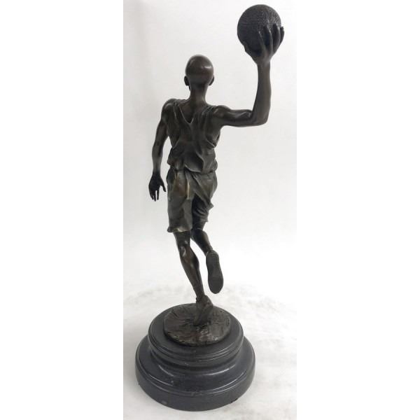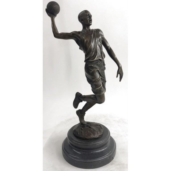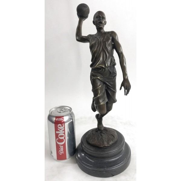 He is a legend on the court. This basketball player tumbles down the court. As he nears the 3-point line, he holds the ball in his large palm and prepares to shoot. He begins to leap towards the net. He wears a typical basketball uniform, a jersey, shorts, and high-top sneakers. This would make a great gift for the basketball lover in your life. This brown patina sculpture was cast using the Lost Wax Method and mounted on a marble base. Dimensions: Height 15 X Width 10 inches. Weight: 8 LBS.
