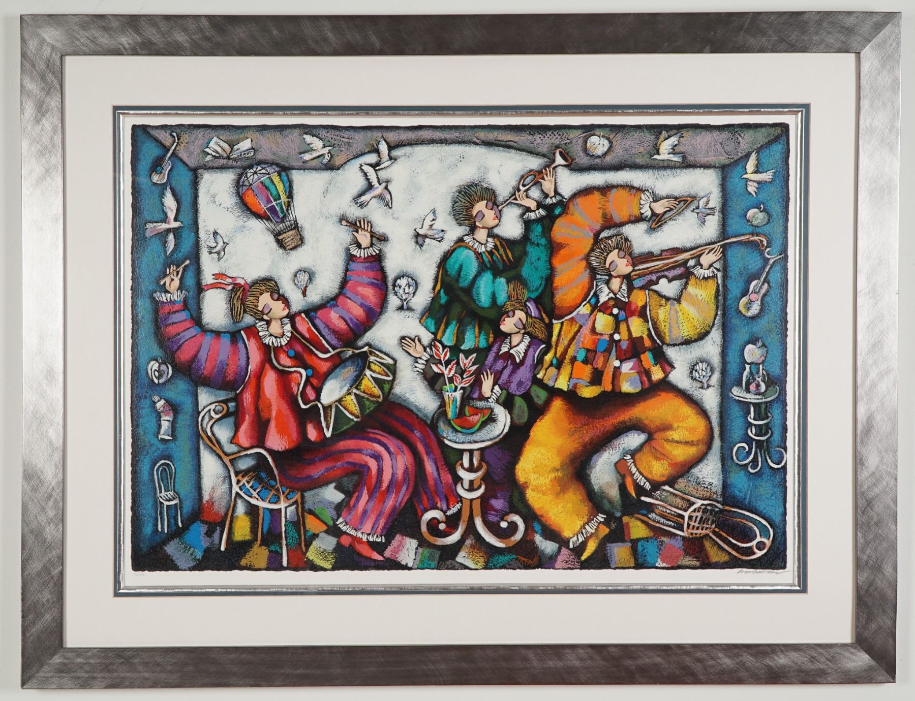 Colorful limited edition serigraph on wove paper by Armenian-Israeli artist Michael Kachan, titled Happy Birthday. This whimsical composition bursts with joyful figures, lively architecture, and fantastical scenery rendered in Kachan's signature folk-inspired style. Executed in vivid tones of red, blue, green, and gold, the artwork features stylized characters dancing, playing music, and engaging in celebration amidst an imaginative village setting. Kachan's work is notable for its harmonious balance of narrative and surrealism, often blending elements of daily life with dreamlike fantasy. Michael Kachan was born in Armenia and later immigrated to Israel, where he became internationally recognized for his vivid, expressionist paintings and prints. Influenced by Russian folk art, Chagall, and the warmth of Mediterranean color, Kachan developed a distinct visual language that blends fantasy, humor, and optimism. His work has been exhibited in galleries across Europe, North America, and Asia, and is collected by private and institutional patrons alike. Kachan continues to live and work in Israel. The serigraph is hand-signed and numbered 76/350 by the artist, presented in a quality frame and mat that enhances its vibrant palette and playful spirit. Certificate of Authenticity included.
