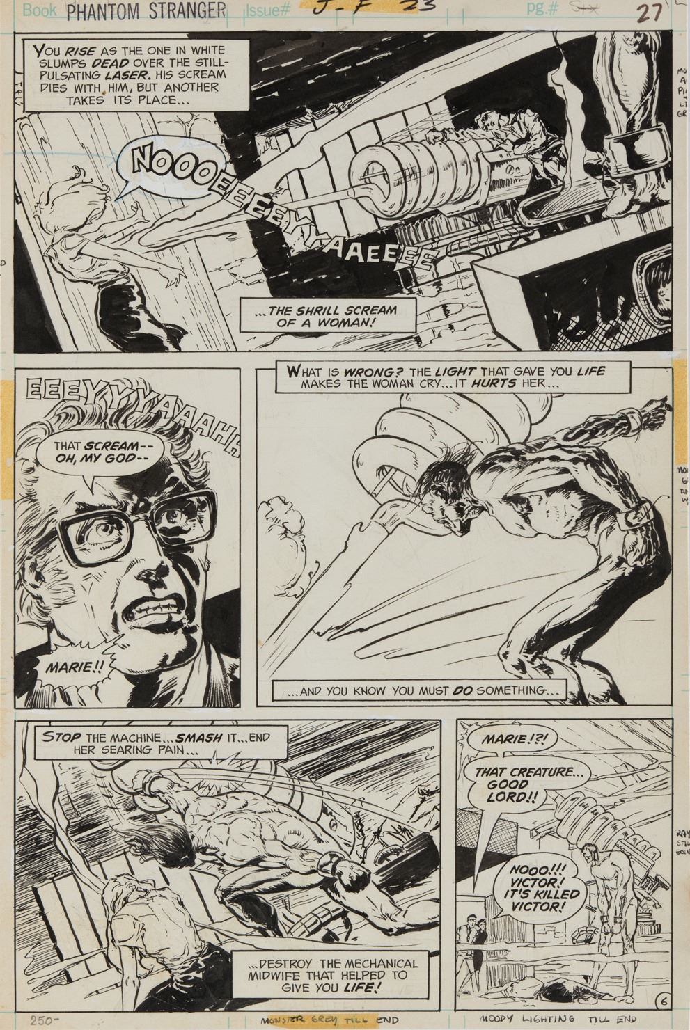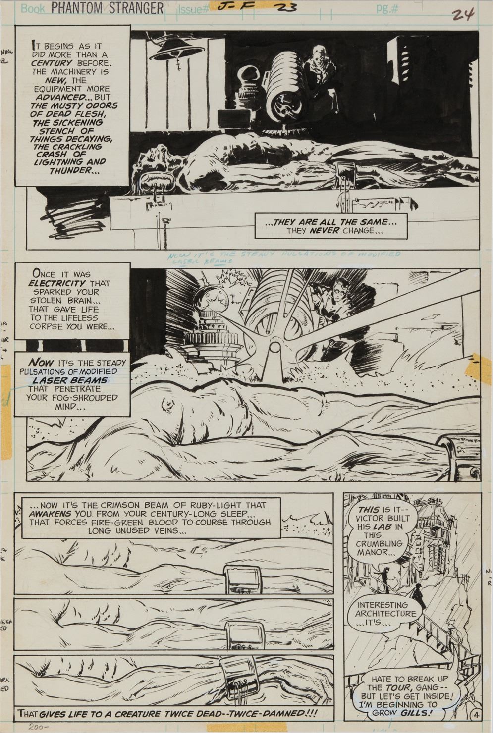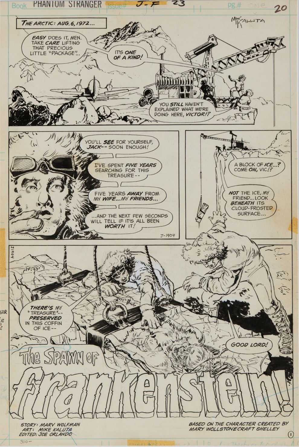 43. Michael Kaluta original artwork for Phantom Stranger #23 complete 8-page story "The Spawn of Frankenstein!" (DC, 1972) Accomplished in pencil and ink on 10.5 x 16 in. comic art stock. Written by Marv Wolfman and masterfully drawn by Mike Kaluta, this DC story brought the Spawn (monster) of Frankenstein into the Bronze Age of DC Horror comics as the popularity of the Universal Monsters found a huge audience in the 1970s (and it should be noted that shortly after in 1973, Marvel also gave Frankenstein's Monster attention via his own comic). In this story we find Dr. Victor Adams has discovered the monster under the arctic ice. After a series of unfortunate mishaps while bringing the monster back to life, the monster is now being hunted by DC's "ghostbreaker" Doctor Thirteen (and would later go on to be hunted by the Phantom Stranger as well). Mike Kaluta's version of this classic monster is drawn so masterfully, it has often been said that it is rivaled only by Bernie Wrightson's own classic version, and in these lushly inked pages you can clearly see why such a complimentary comparison was made. Some really great lab scenes as we see how the monster gets brought back to life...again! Some production tape marks/glue stains on edges and a small amount of correction fluid. Otherwise in very good condition. $6,000 - $8,000