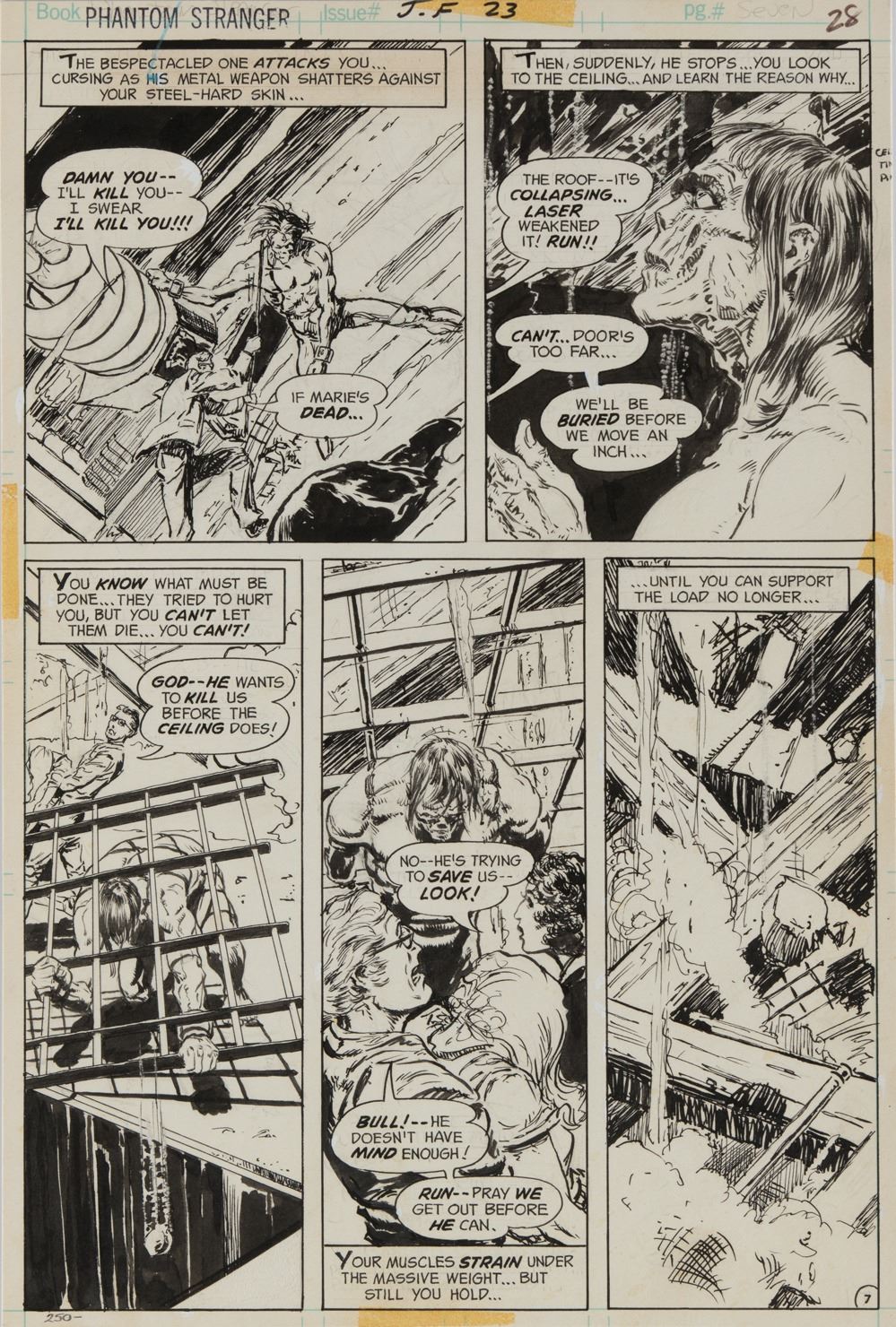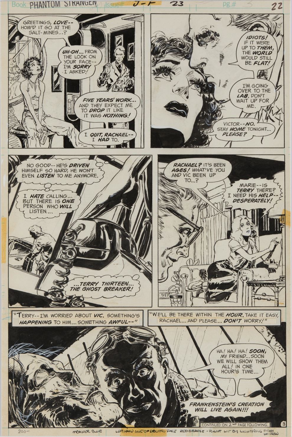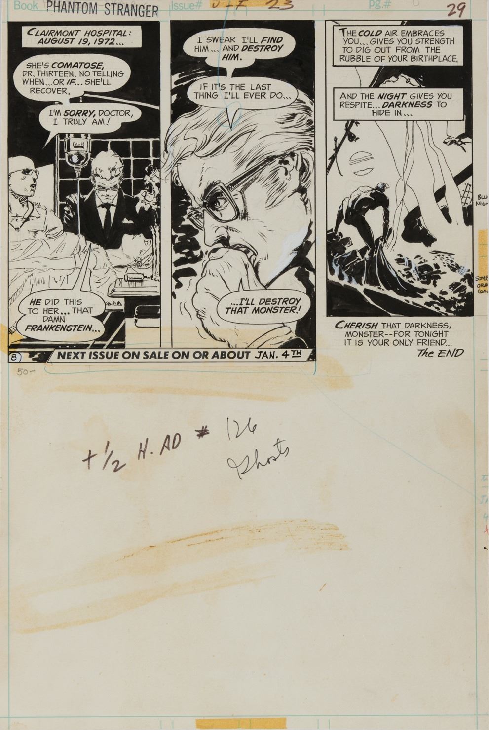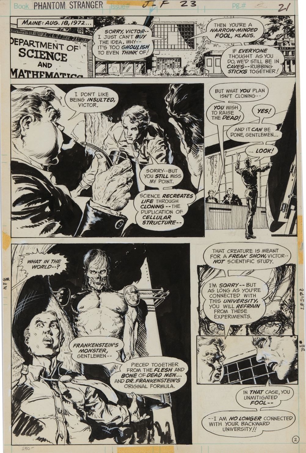 43. Michael Kaluta original artwork for Phantom Stranger #23 complete 8-page story "The Spawn of Frankenstein!" (DC, 1972) Accomplished in pencil and ink on 10.5 x 16 in. comic art stock. Written by Marv Wolfman and masterfully drawn by Mike Kaluta, this DC story brought the Spawn (monster) of Frankenstein into the Bronze Age of DC Horror comics as the popularity of the Universal Monsters found a huge audience in the 1970s (and it should be noted that shortly after in 1973, Marvel also gave Frankenstein's Monster attention via his own comic). In this story we find Dr. Victor Adams has discovered the monster under the arctic ice. After a series of unfortunate mishaps while bringing the monster back to life, the monster is now being hunted by DC's "ghostbreaker" Doctor Thirteen (and would later go on to be hunted by the Phantom Stranger as well). Mike Kaluta's version of this classic monster is drawn so masterfully, it has often been said that it is rivaled only by Bernie Wrightson's own classic version, and in these lushly inked pages you can clearly see why such a complimentary comparison was made. Some really great lab scenes as we see how the monster gets brought back to life...again! Some production tape marks/glue stains on edges and a small amount of correction fluid. Otherwise in very good condition. $6,000 - $8,000