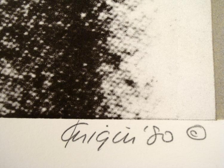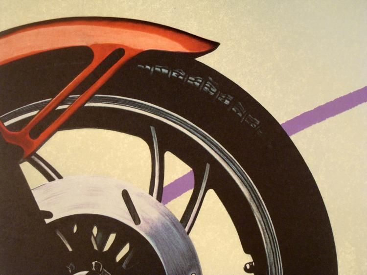 This print portrays what happens when you try to burn rubber on a motorcycle...Artist: Michael KiriguTitle: "Crimson Beau" Condition: Excellent Size: 24 1/2" x 36"Medium: Print on paper Date: 1980 Dedicated: "Michel"