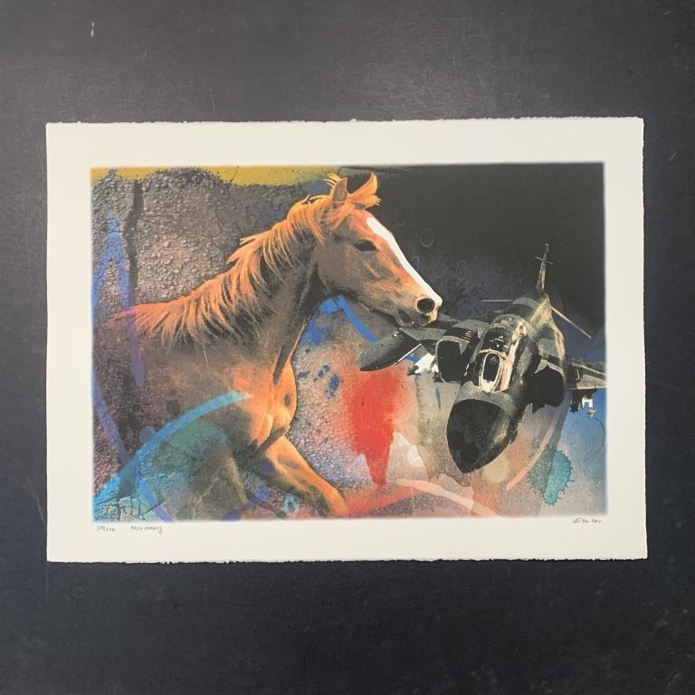 Michael Knigin's "Arch Enemy" limited edition print, signed lower right and numbered 124/200. This piece is of a close up of a horse, as well as an army fighter plane. This piece is in excellent condition.