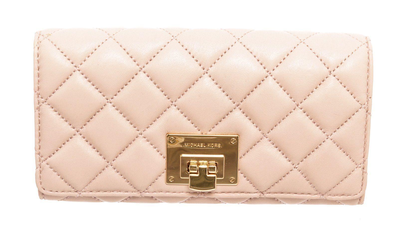 Michael Kors beige Astrid leather flap lock wallet with gold-tone hardware, logo placard at front, beige canvas leather interior lining, five interior pockets; one with zip closure, sixteen cardholder slots and overall flap lock closure at front. Measurements: Length: 7.85 in / 20 cm Width: 1.1 in / 3 cm 4.65 in / 12 cmCONDITION: Pre-Owned Good overall, please see photographs for detail.