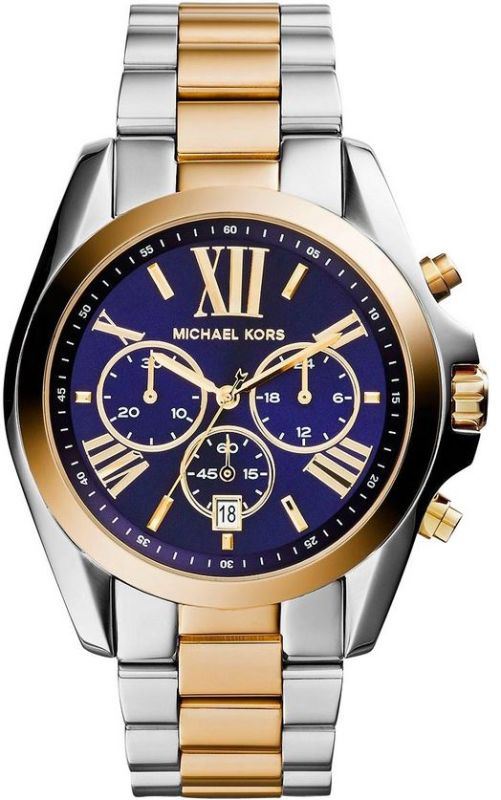 Model: MK5976 - CASE = [Material:Stainless Steel], [Case Diameter:43], [Case Thickness:13mm], [Bezel:Fixed], [Case Back:Solid], [Water Resistant:100 Meters - 330 Feet], [Crystal:Scratch Resistant Sapphire], DIAL = [Color:Blue], MOVEMENT = [Type:Quartz], [Crown:Push In], BAND = [Clasp:Folding], [Type:Two-Tone Stainless Steel], (Usually ships in 1 to 2 business days.)