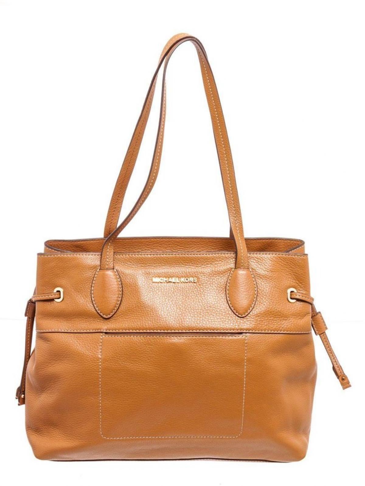 Michael Kors Brown Mae Large EW Tote Bag with gold-tone hardware, interior zip pockets, dual top handles, leather shoulder strap, and zipper closure.         Measurements:  Length: 10.5 in / 27 cm  Width: 5 in / 13 cm  14 in / 36 cmCONDITION: Pre-Owned Good overall, please see photographs for detail.