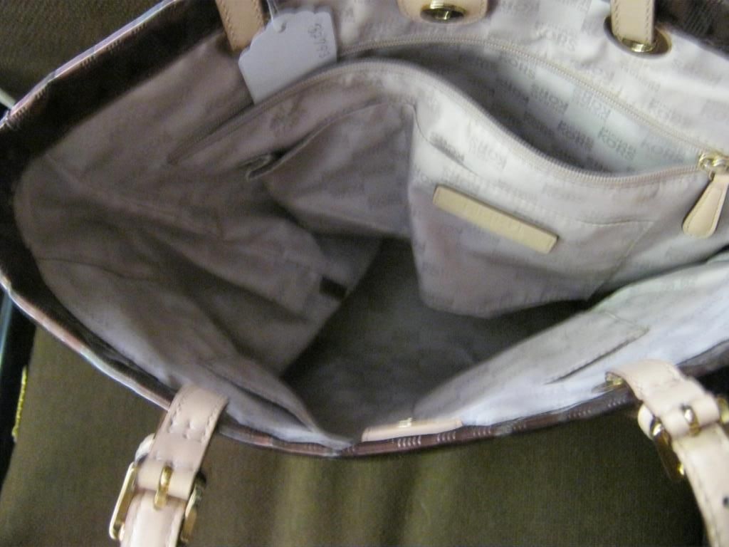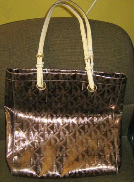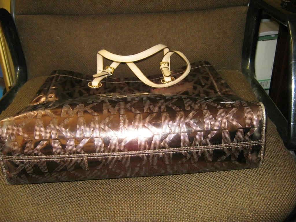 This does not come with a dust bag. Measures: 13 "(w) X 14"(H) X 3" (W) Color is N.S. Copper/rose gold Metallic Tote with beige leather straps - Gold tone hardware.