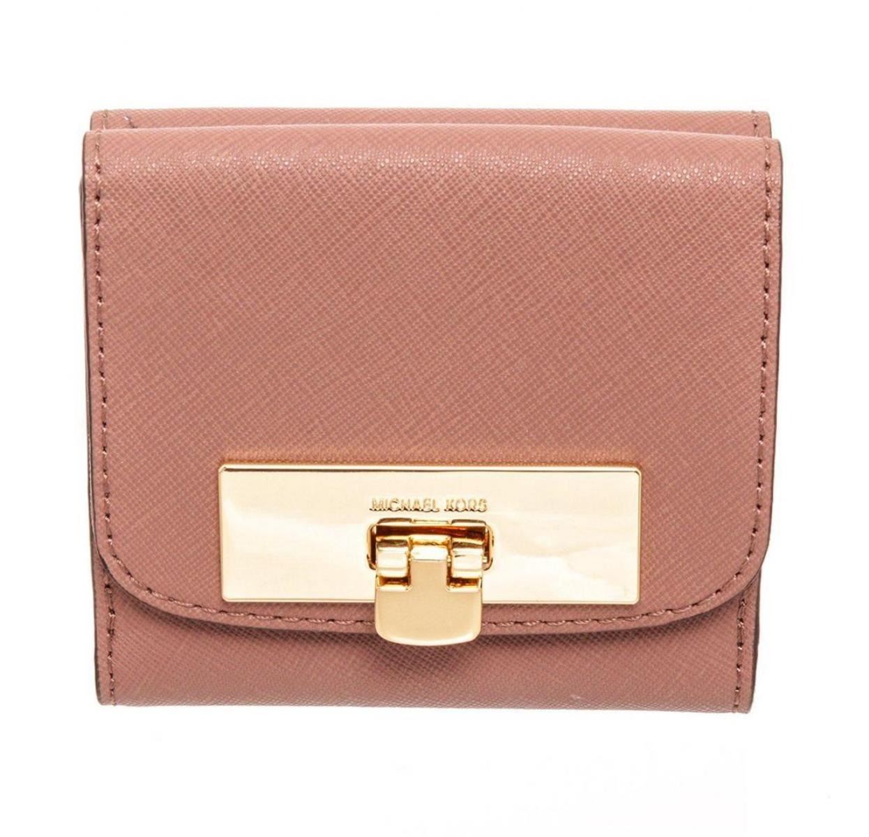 Michael Kors mauve leather Callie trifold wallet with gold-tone hardware, logo placard at front, coin pouch at front flap with flap lock closure, canvas and leather interior lining, one bill compartment, one ID holder, eight cardholder slots and overall snap closure at back flap. Measurements: Length: 4.15 in / 11 cm Width: 4.25 in / 11 cm 4.15 in / 11 cmCONDITION: Pre-Owned Good overall, please see photographs for detail.
