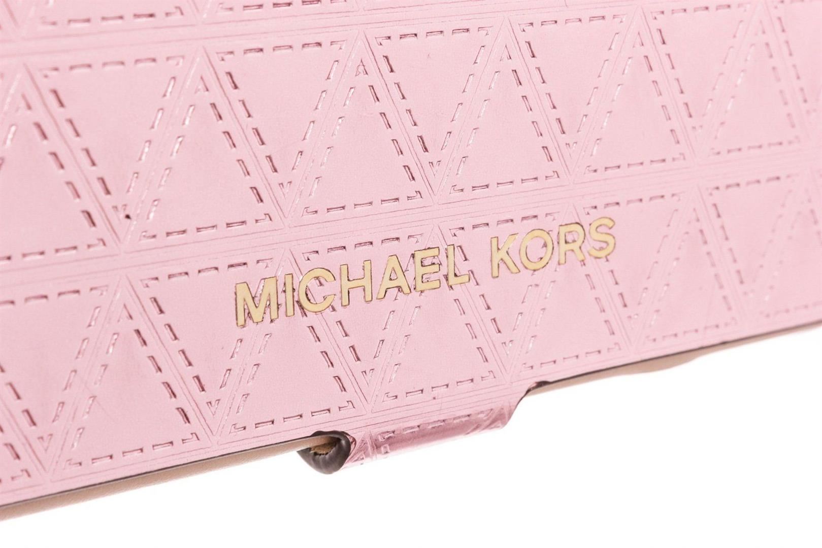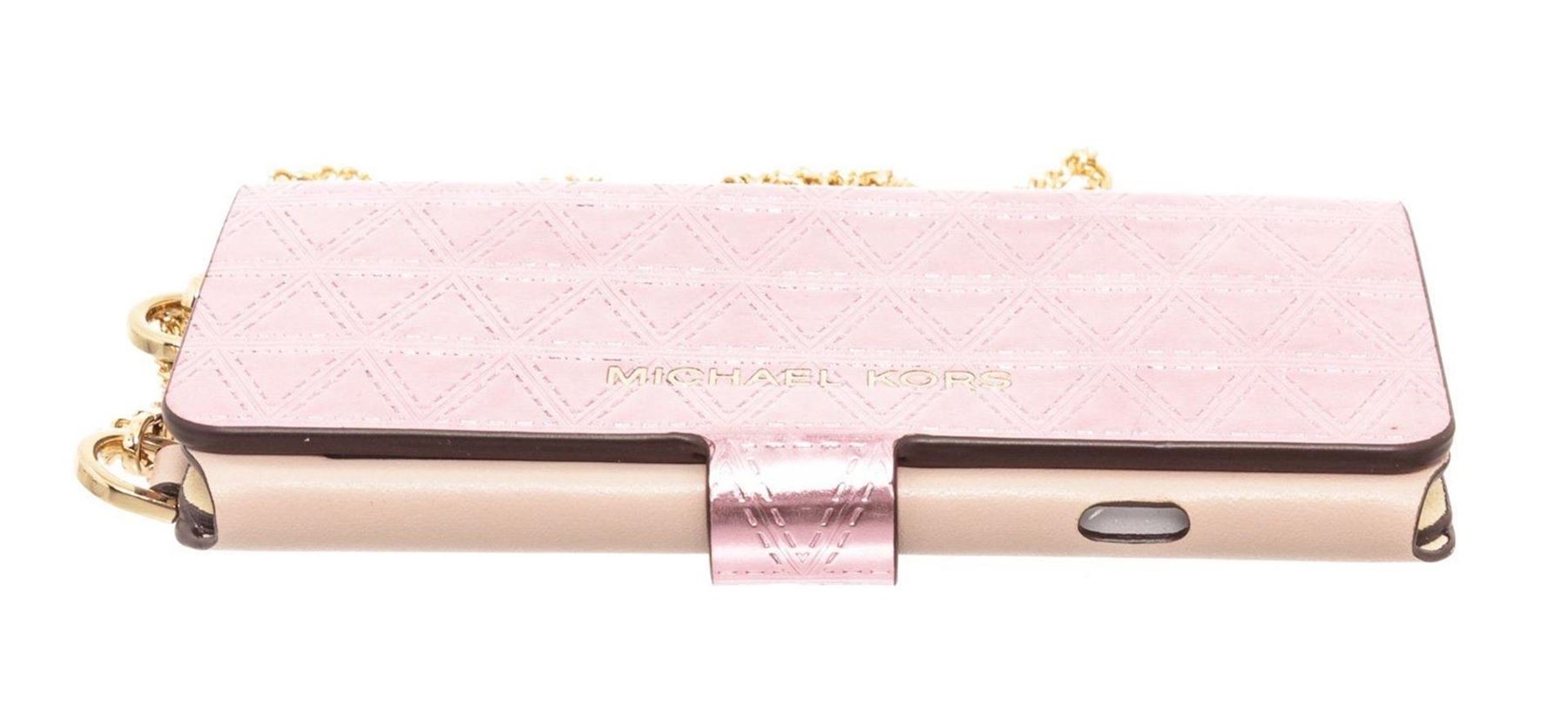 Michael Kors metallic pink leather Iphone 7 Folio case with gold-tone hardware, embossed logo at front, single pocket at back, single chain strap, leather and suede interior lining, Iphone case holder, two interior pockets and overall snap closure at front.