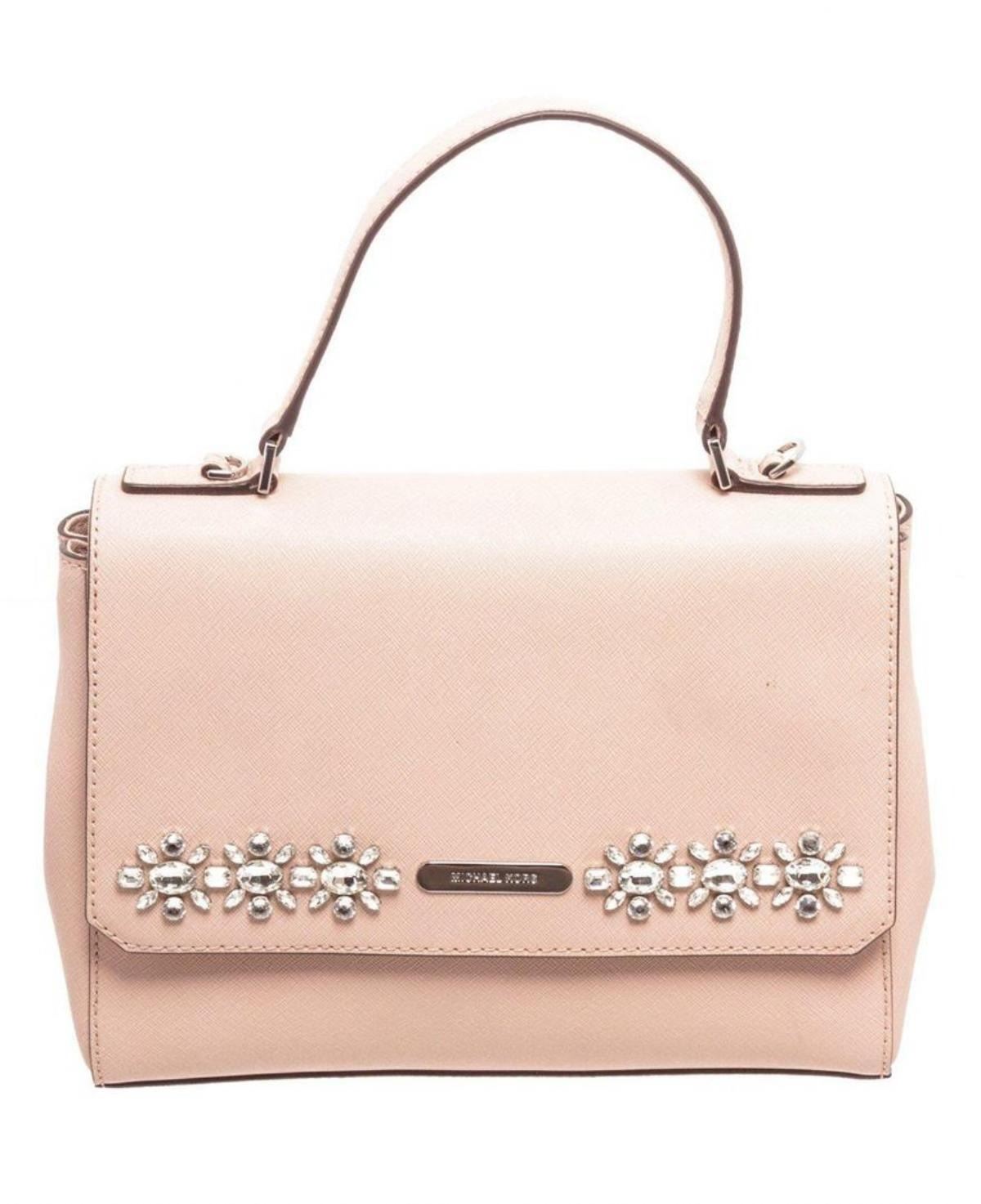 Michael Kors Pink Callie Jewel Satchel with gold-tone hardware, interior zip pockets, top handles, leather shoulder strap, and flap closure. Measurements: Length: 7.5 in / 19 cm Width: 3 in / 8 cm 10 in / 25 cmCONDITION: Pre-Owned Good overall, please see photographs for detail.