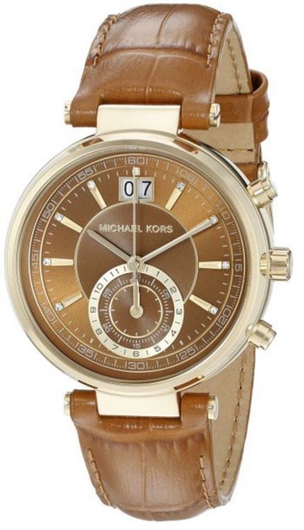 Model: MK2424 - CASE = [Material:Yellow Gold Plated Stainless Steel], [Case Diameter:39], [Case Thickness:11mm], [Bezel:Fixed], [Case Back:Solid], [Water Resistant:100 Meters - 330 Feet], [Crystal:Scratch Resistant Mineral], DIAL = [Color:Brown], MOVEMENT = [Type:Quartz], [Crown:Push In], BAND = [Clasp:Tang], [Type:Brown Alligator Leather], (In Stock - Ready to ship.)