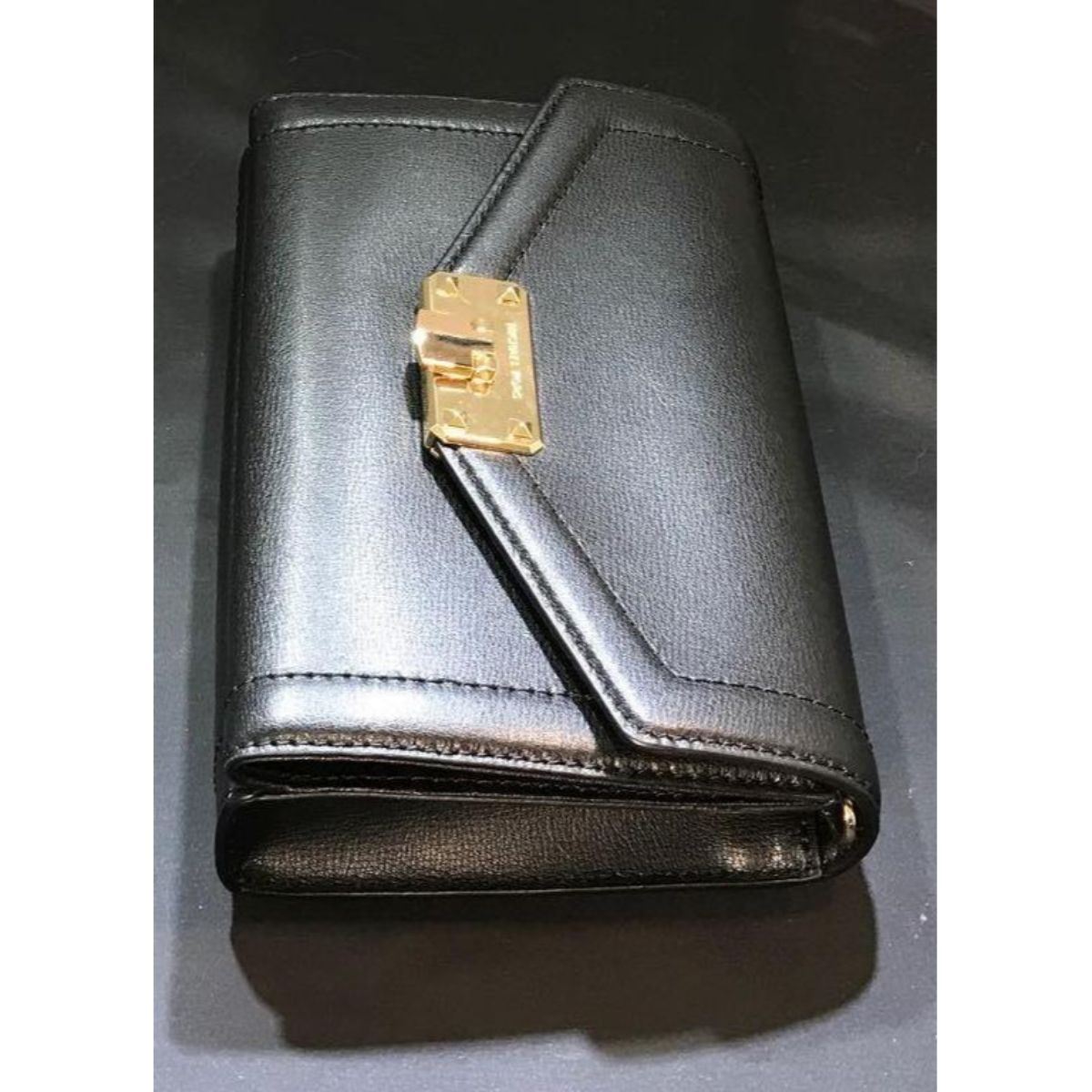 Small, black genuine leather Michael Kors designer hand purse with black strap and gold snap. - #249-249-8