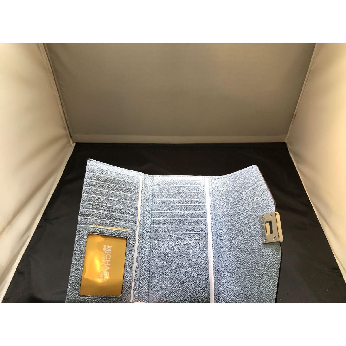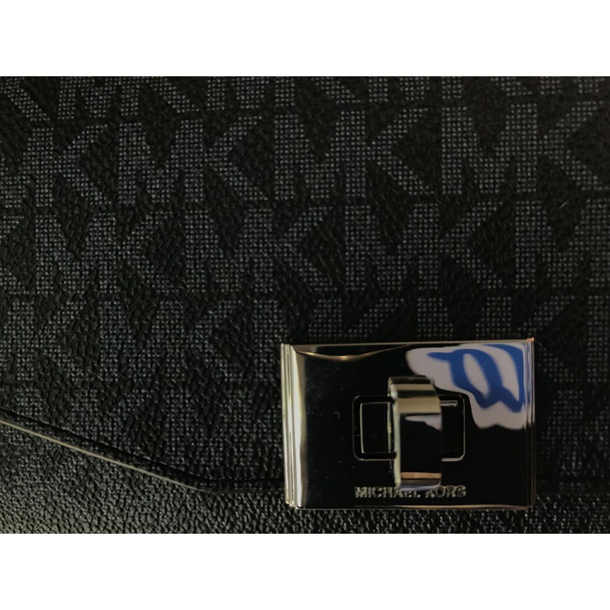 Small, black genuine leather Michael Kors designer hand purse with black strap and gold snap. MK logo covering the outside. - #250-250-9