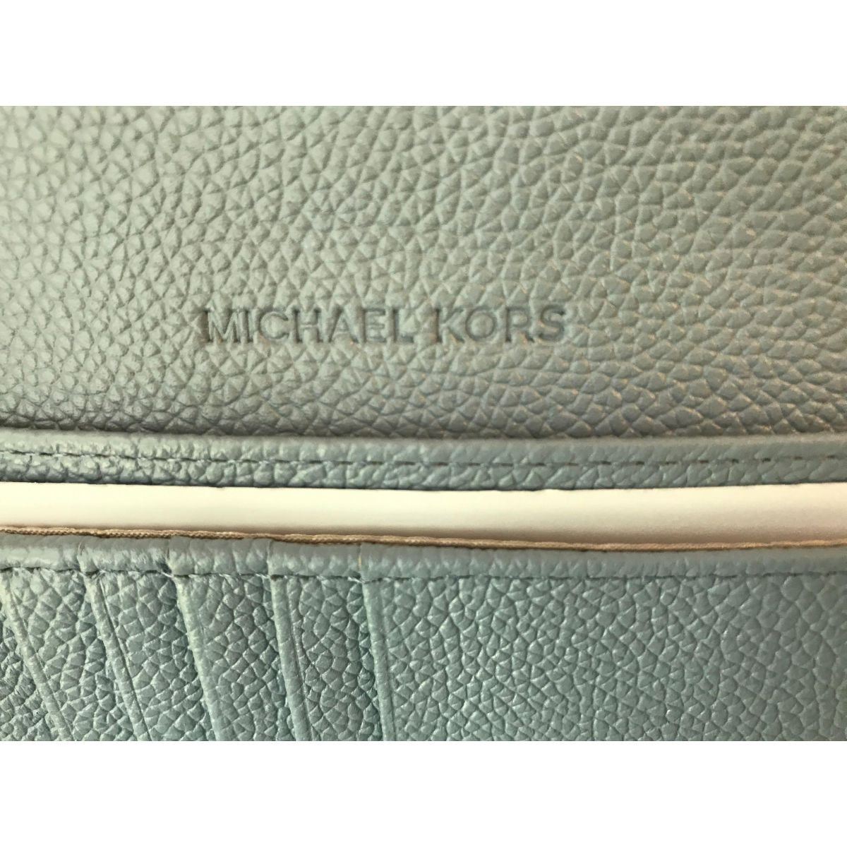Small, black genuine leather Michael Kors designer hand purse with black strap and gold snap. MK logo covering the outside. - #250-250-9