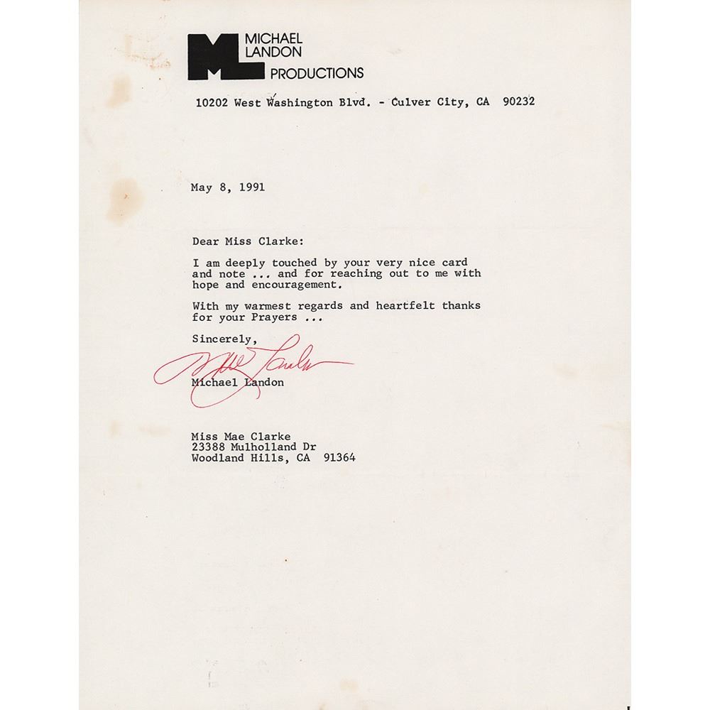 TLS, one page, 8.5 x 11, Michael Landon Productions letterhead, May 8, 1991. Letter to Frankenstein actress Mae Clarke, in full: "I am deeply touched by your very nice card and note…and for reaching out to me with hope and encouragement. With my warmest regards and heartfelt thanks for your Prayers." In fine condition, with scattered light stains.
