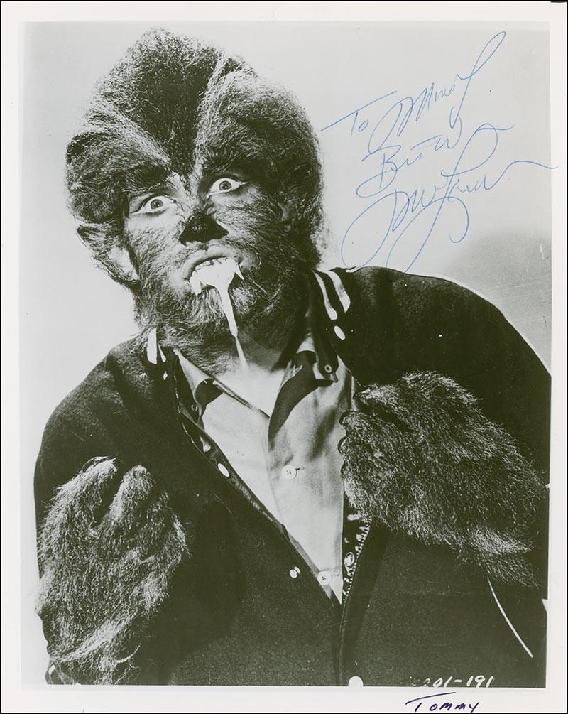 Very rare vintage glossy 8 x 10 photo of Landon as he appeared in I Was a Teenage Werewolf, signed and inscribed in blue ballpoint. In fine condition, with small notation to lower border.