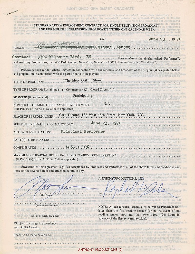 DS, one page, 8.5 x 11, June 23, 1970. Standard AFTRA contract in which Landon agrees to appear on The Merv Griffin Show on the same day in exchange for $265 plus a 10% agency commission. Signed at the conclusion in ballpoint by Landon. A standard AFTRA rider is stapled to the main document in the upper left. In fine condition, with expected document wear.
