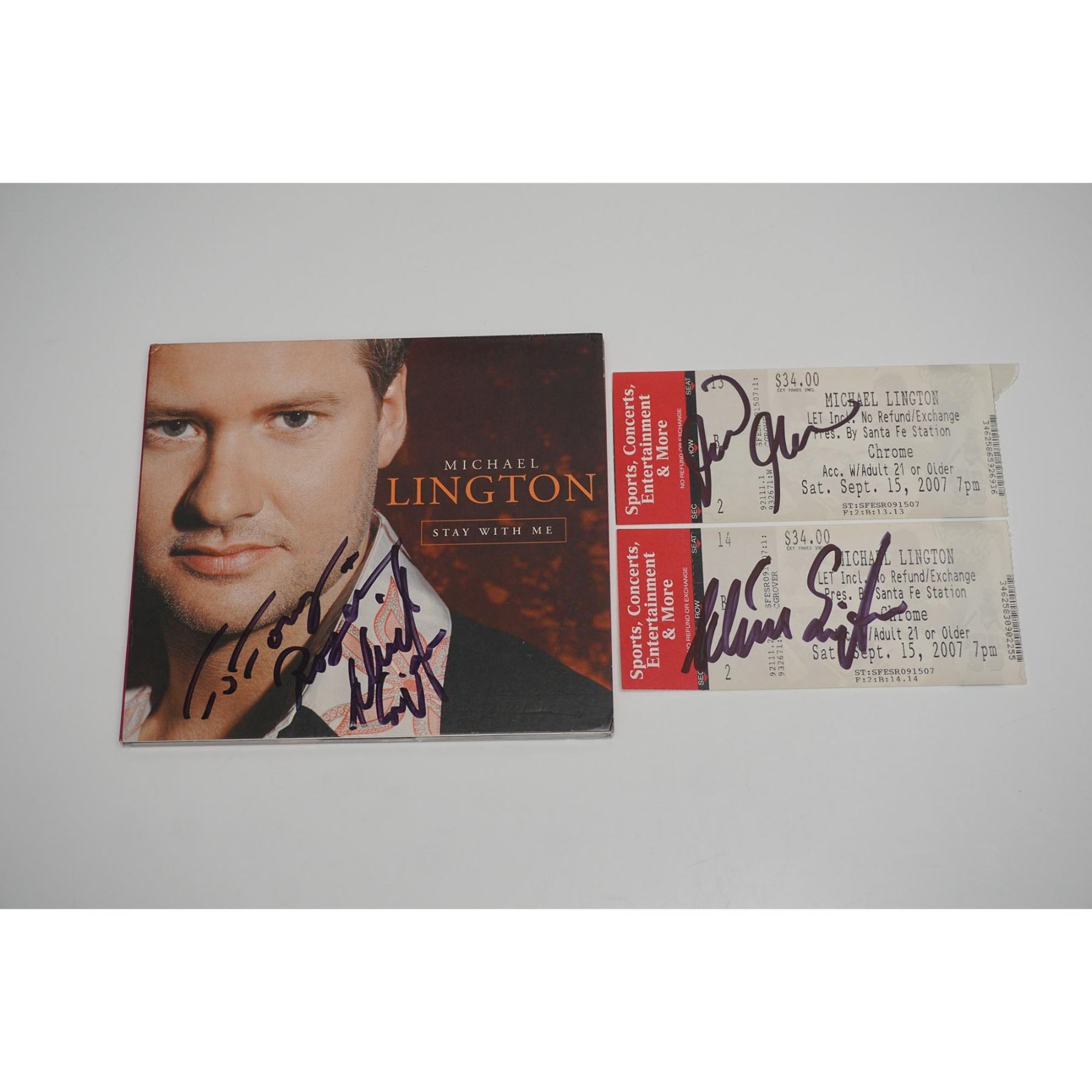 A signed Michael Lington Stay With Me CD cover, autographed in bold black marker on the front. The CD cover features the smooth jazz saxophonist's portrait along with his name and album title. Also included are two signed concert tickets from a September 15, 2007 performance at Santa Fe Station, Las Vegas. The signatures are clearly visible, enhancing the collectible value of this lot. A fantastic piece for jazz music enthusiasts and autograph collectors. CD: 5.5"L x 5"H. Ticket: 4.75"L x 2"H.