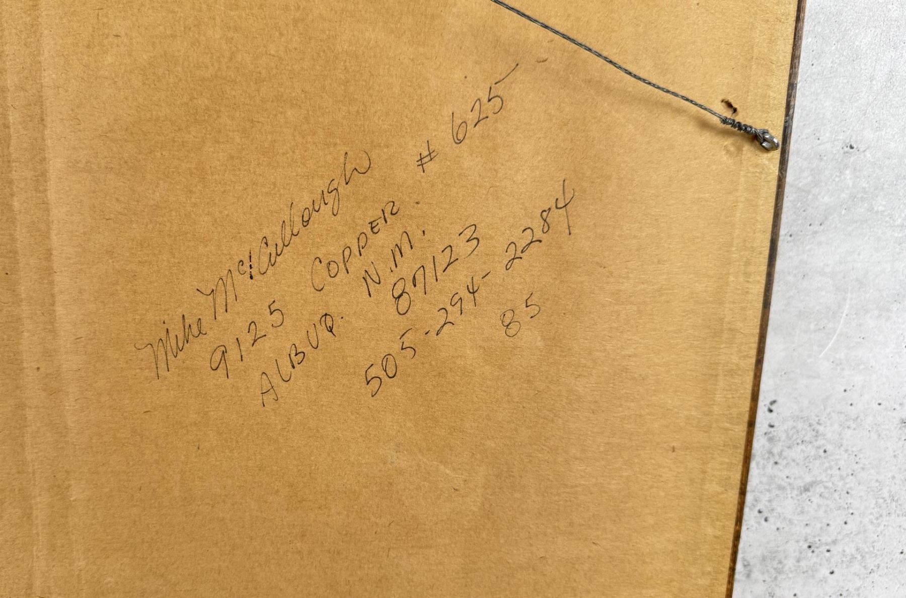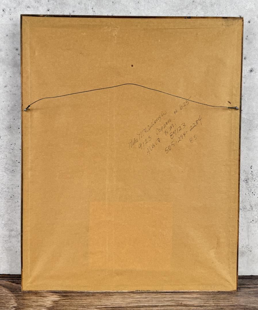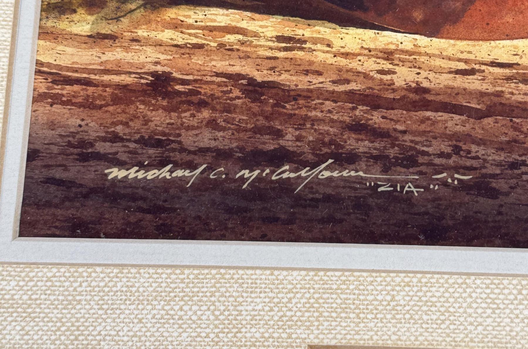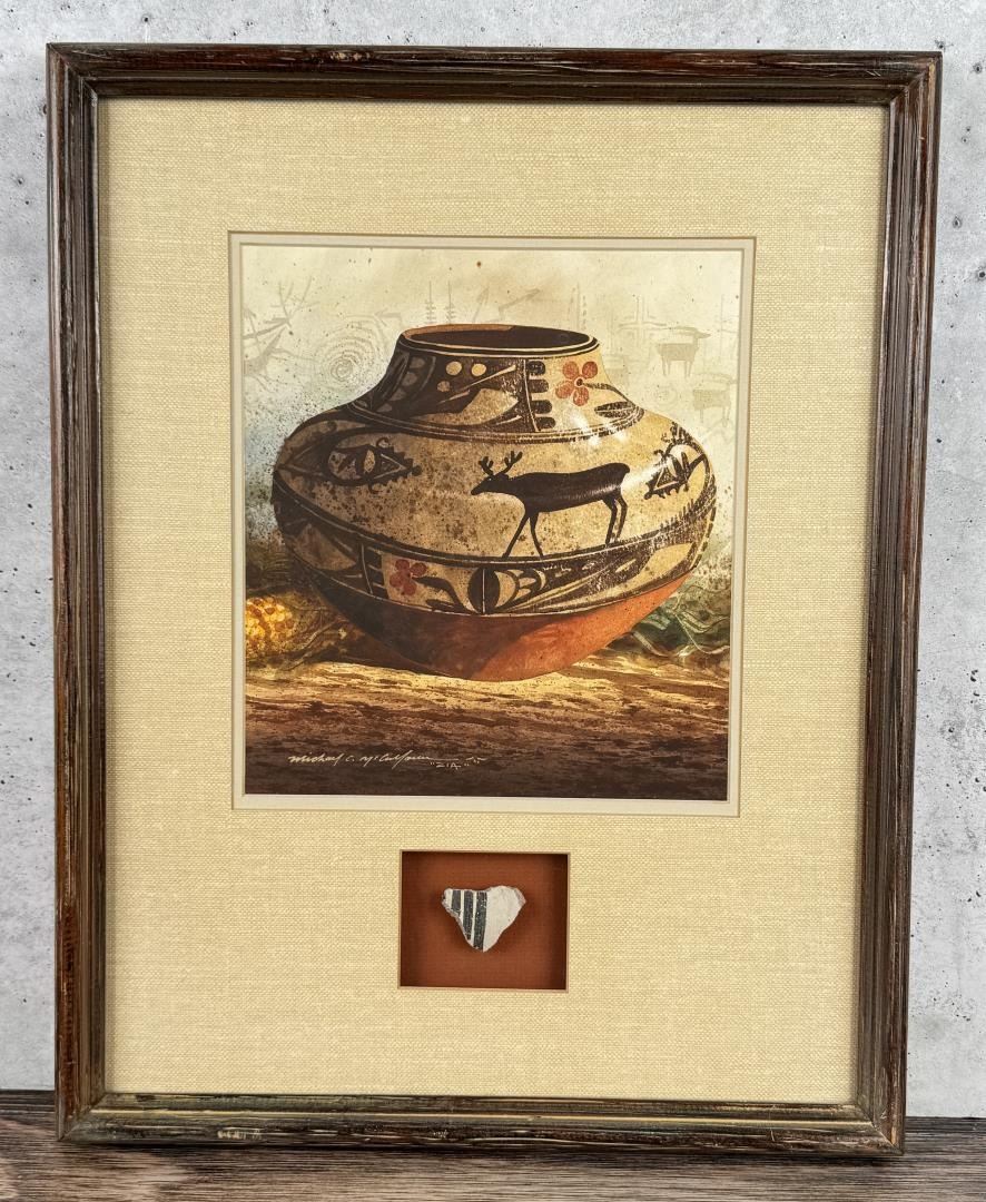 Title of Painting is Zia. 9" by 10" unframed. 15 3/8" by 19 3/8" framed. Gouache on Board. Michael C. McCullough (Born 1951) was active/lived in New Mexico. Michael McCullough is known for Mountain landscape and Southwest pottery painting. The following information is from William Kaye who wrote the following about a painting by Michael McCullough, which Kaye and his wife placed over the fireplace in their living room: When my wife Cindy and I were in the southwestern U.S. in April/May 1989, we bought this watercolor, depicting Three Indian Pottery Vases, representing three Indian tribes in New Mexico: the Zuni, the Acoma, and the ancient Anasazi. The artist, Michael McCullough is a Native American. The vase shown at the right in the painting is based on shards excavated by the archeologists working for the Public Service Company in New Mexico. The shards are then catalogued by the state and given back to the company, where they are made available to artists such as Michael McCullough. The shards, shown at the bottom of the work of art, date back to 1100-1250 A.D. and were probably Anasazi relics. The other two vases are traditional Zuni and Acoma vases.