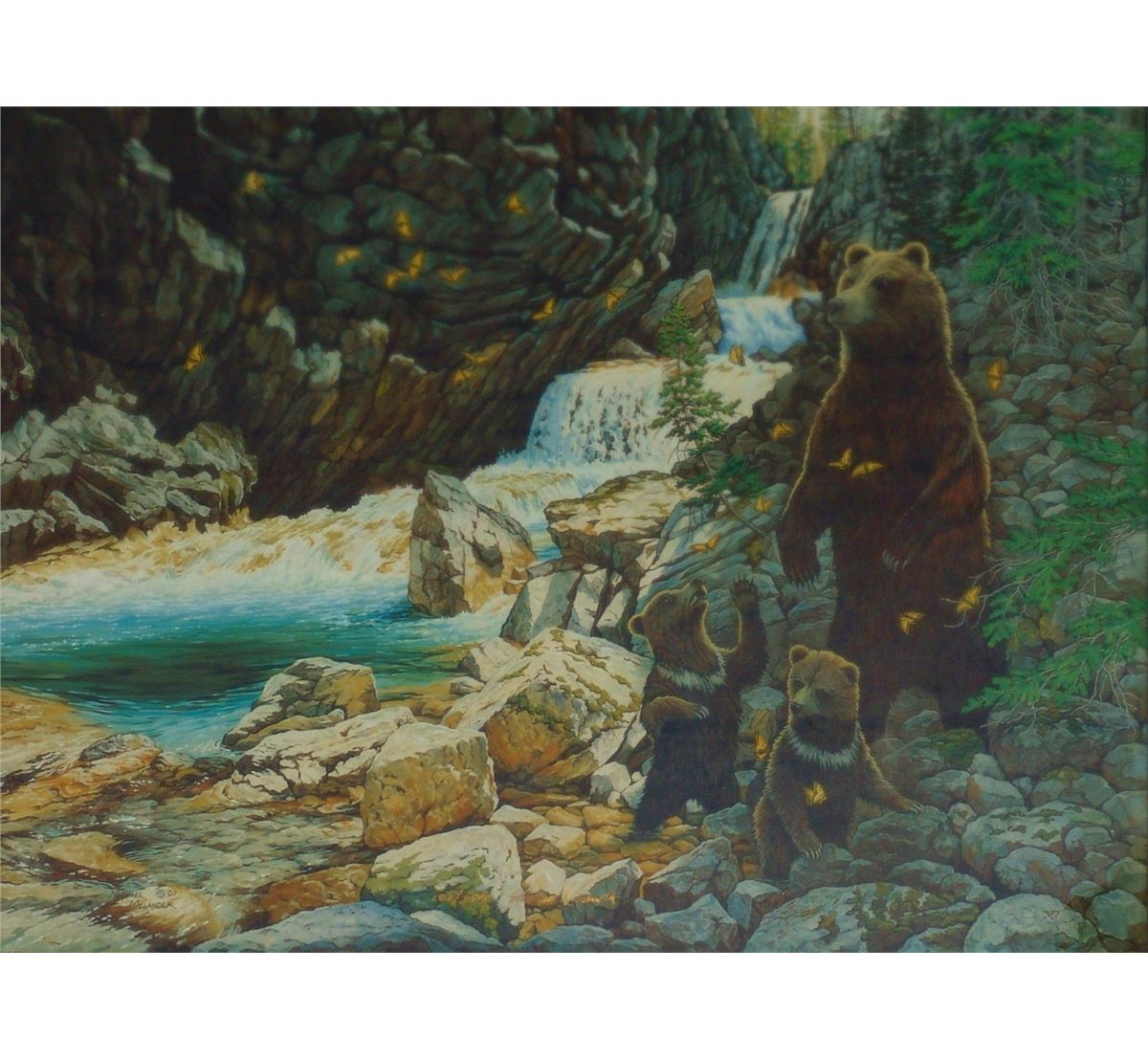 Grizzly bear and cubs at waterfall, 32" x 24", very nice frame, size with frame 49" x 41", -5621013-