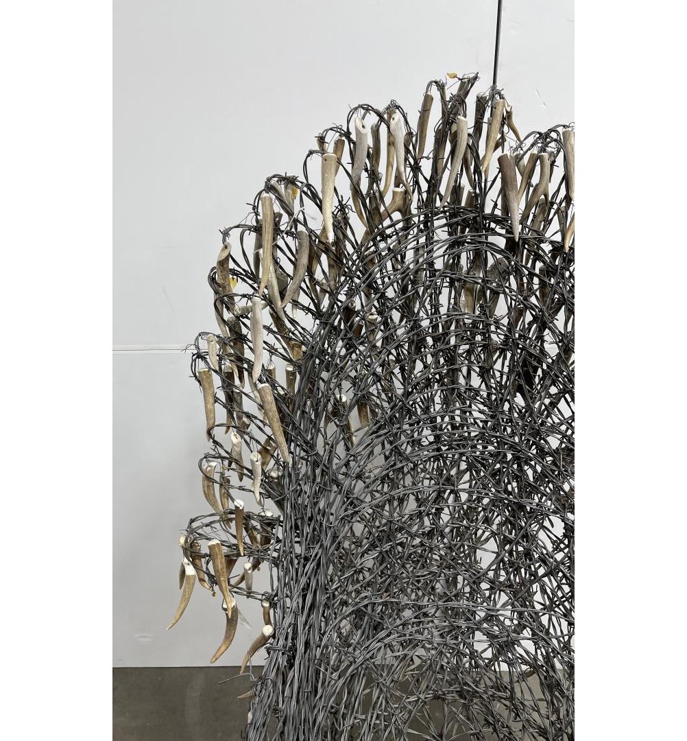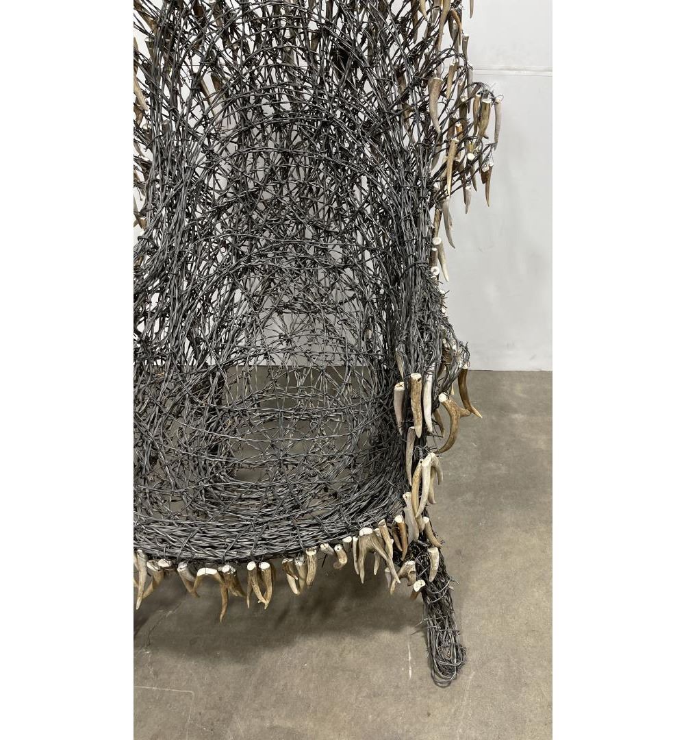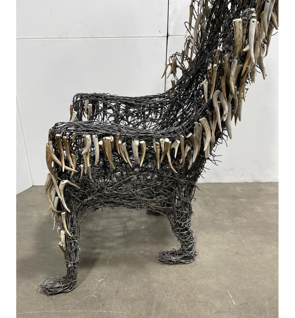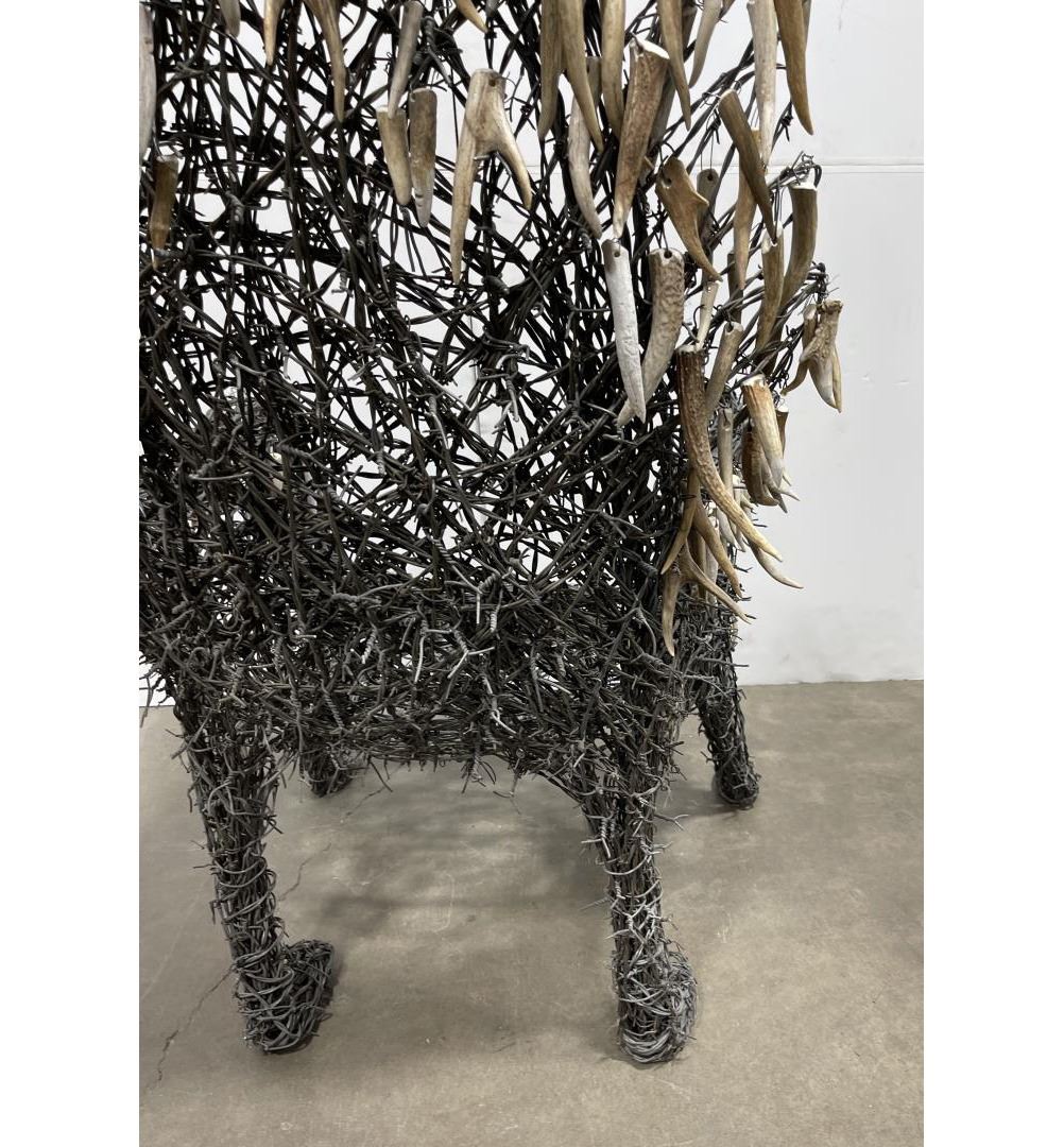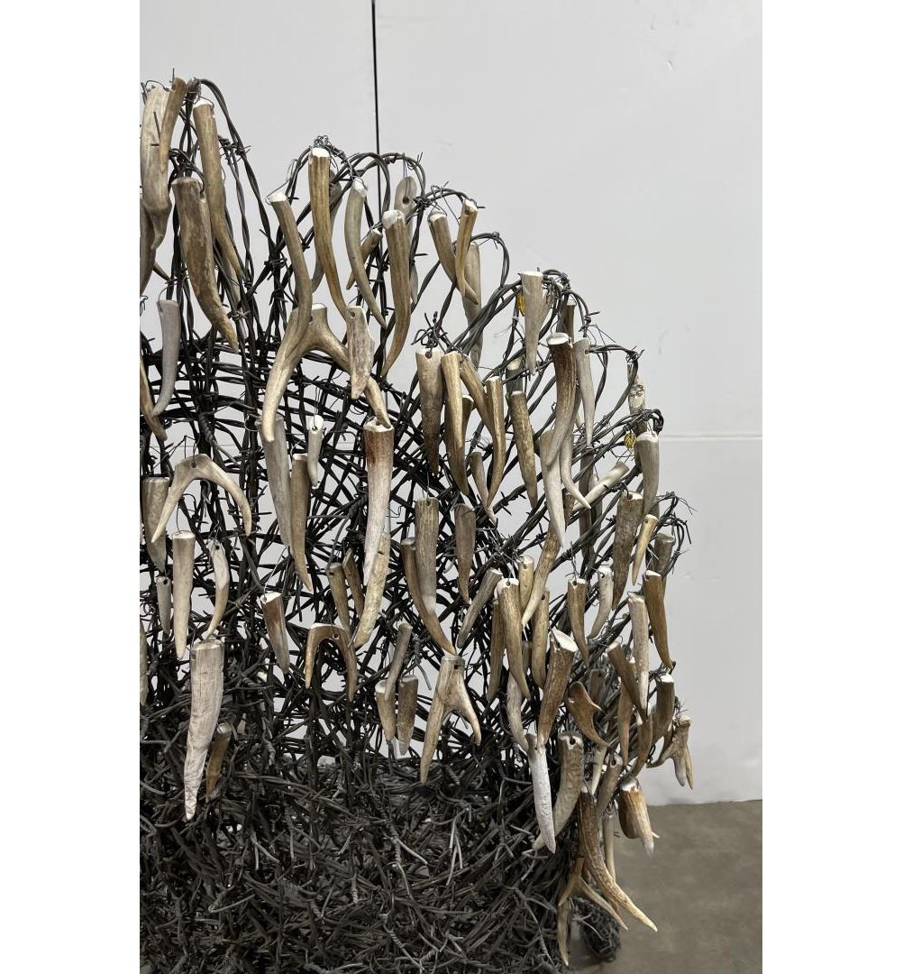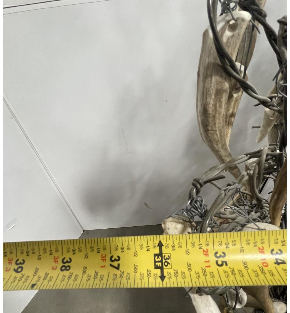 32" by 34" by 59" tall. Fascinating statement piece, lots of movement and sway in the hanging antler pieces. Michael Miller (1959-2021). Adopted at the age of 2 by a Mennonite family, Michael was raised on the Oregon coast. He began woodworking at the age of 14. At age 21, Michael opened his first woodworking shop and made high end cabinetry and fine furniture. Michael's work has been featured at many art shows in California and at the Maritime Museum in Monterey, California. Later moving to Montana, Michael collected everything from wood to spent brass and turned them into masterful works of art.
