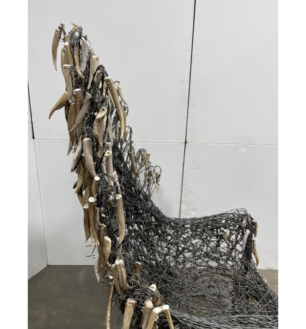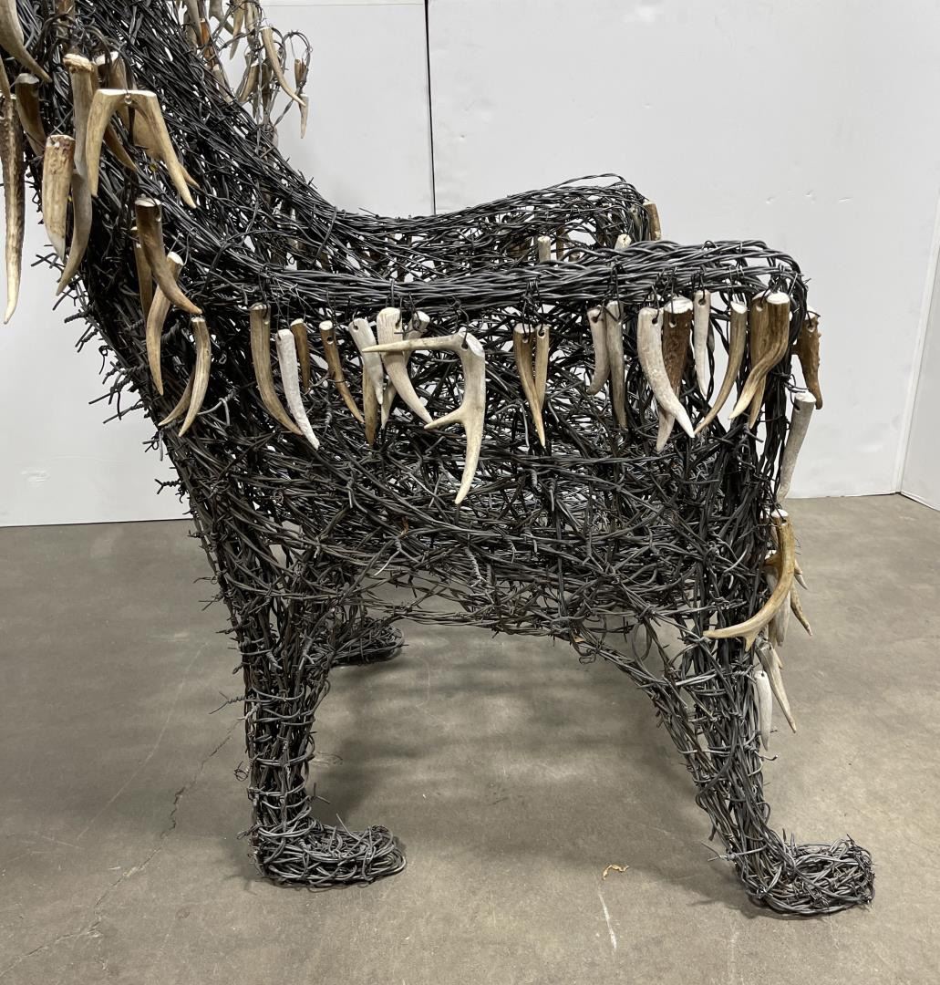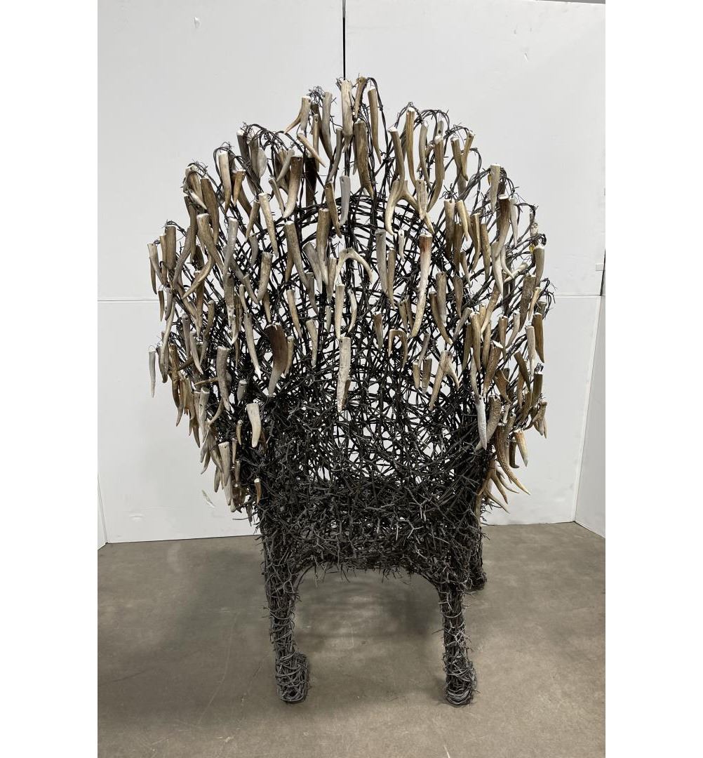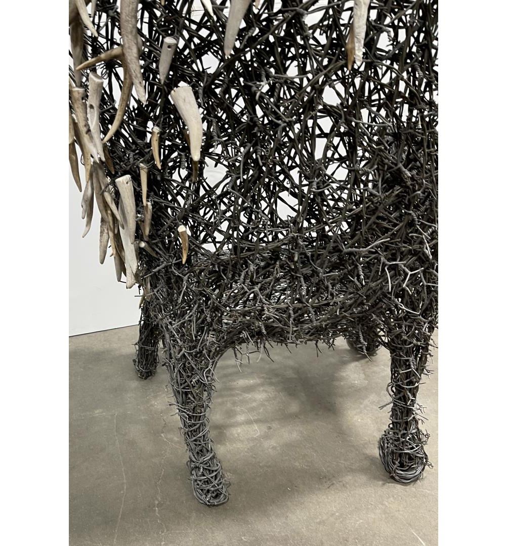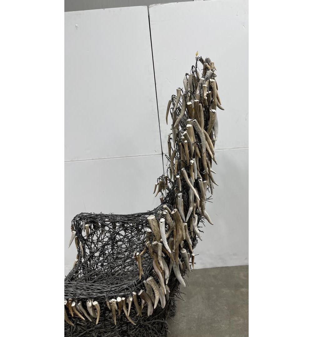 32" by 34" by 59" tall. Fascinating statement piece, lots of movement and sway in the hanging antler pieces. Michael Miller (1959-2021). Adopted at the age of 2 by a Mennonite family, Michael was raised on the Oregon coast. He began woodworking at the age of 14. At age 21, Michael opened his first woodworking shop and made high end cabinetry and fine furniture. Michael's work has been featured at many art shows in California and at the Maritime Museum in Monterey, California. Later moving to Montana, Michael collected everything from wood to spent brass and turned them into masterful works of art.