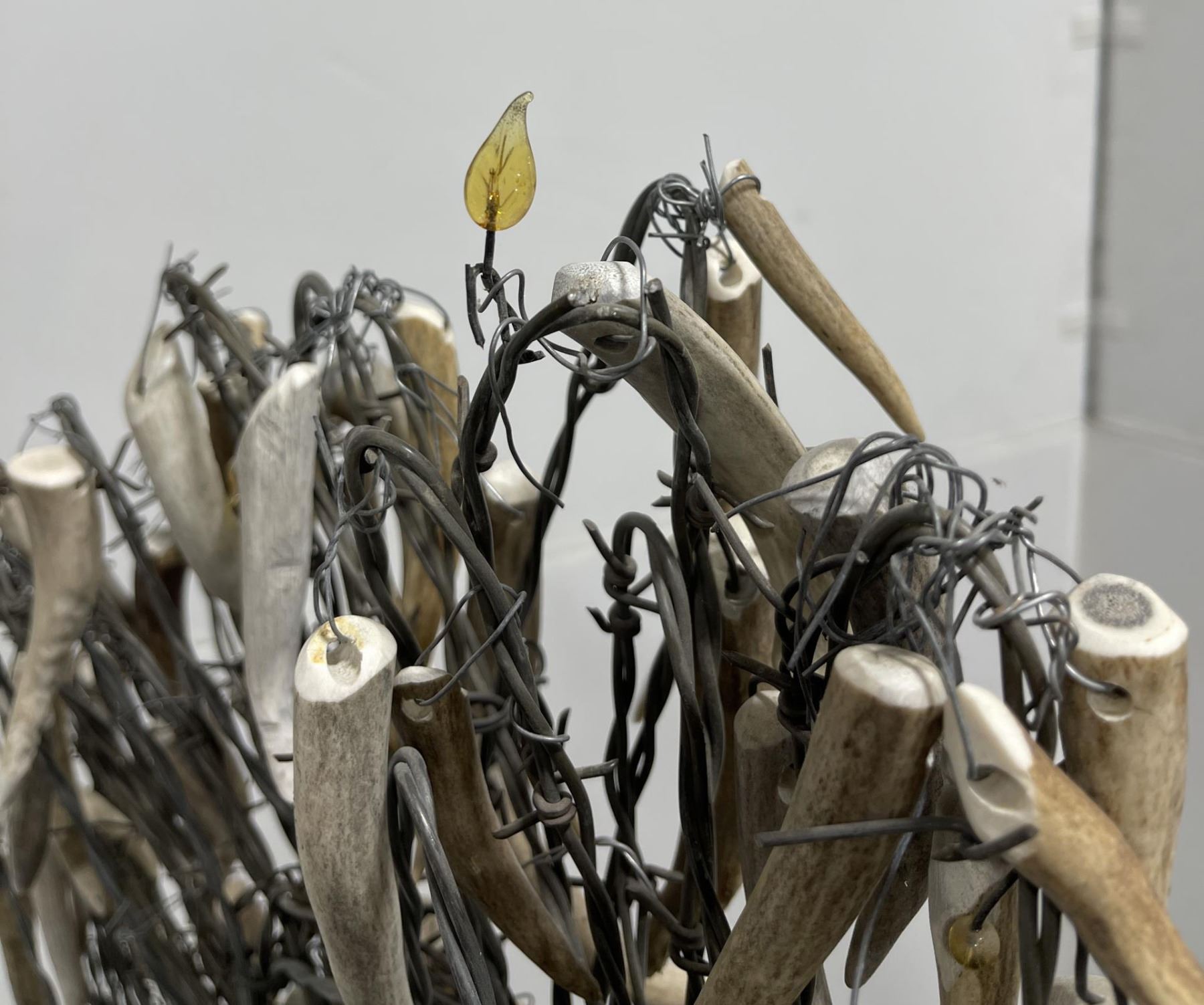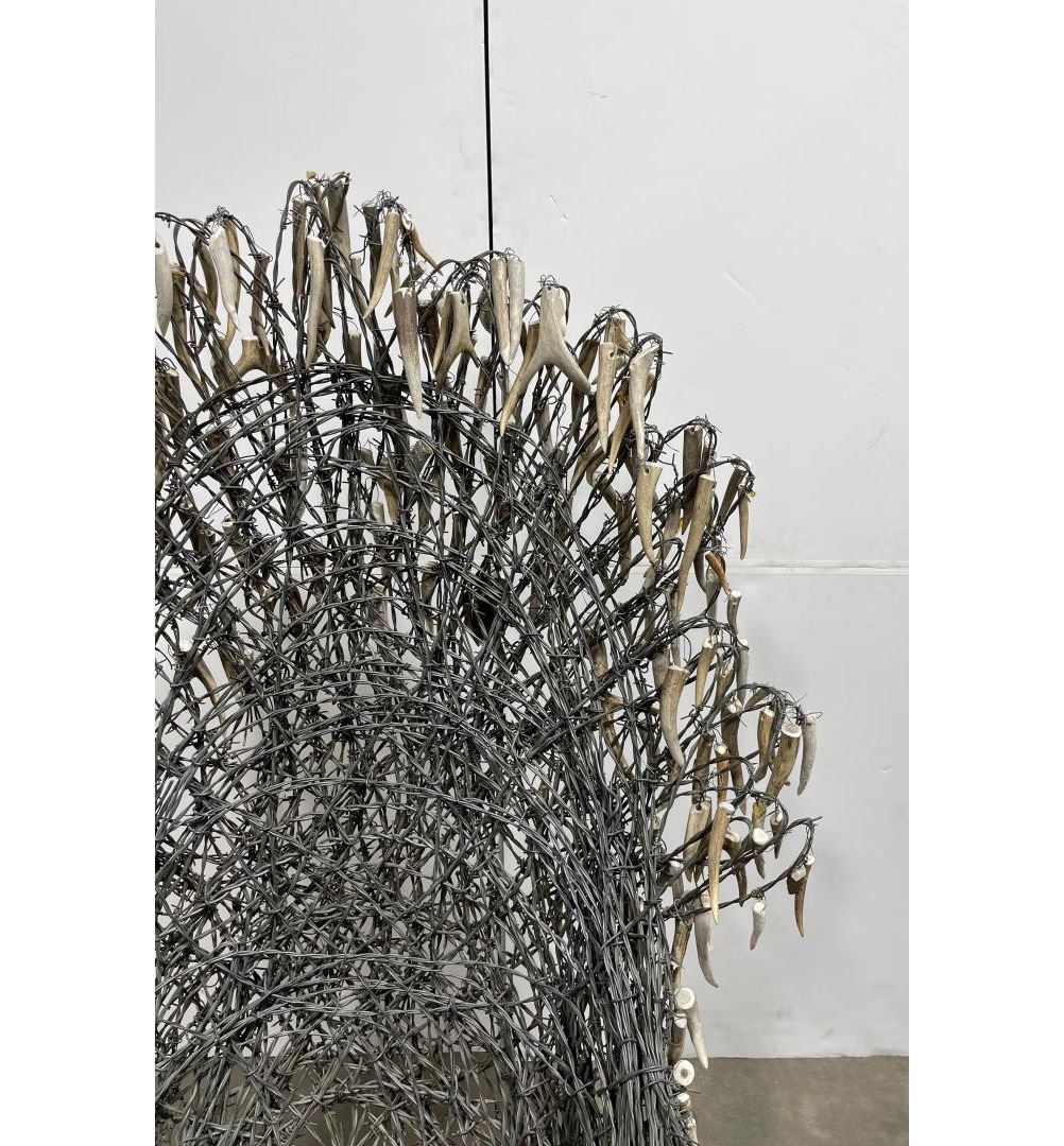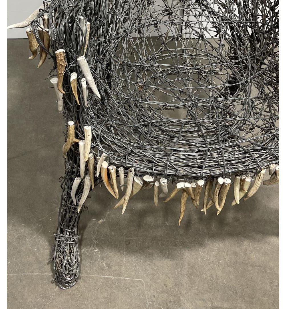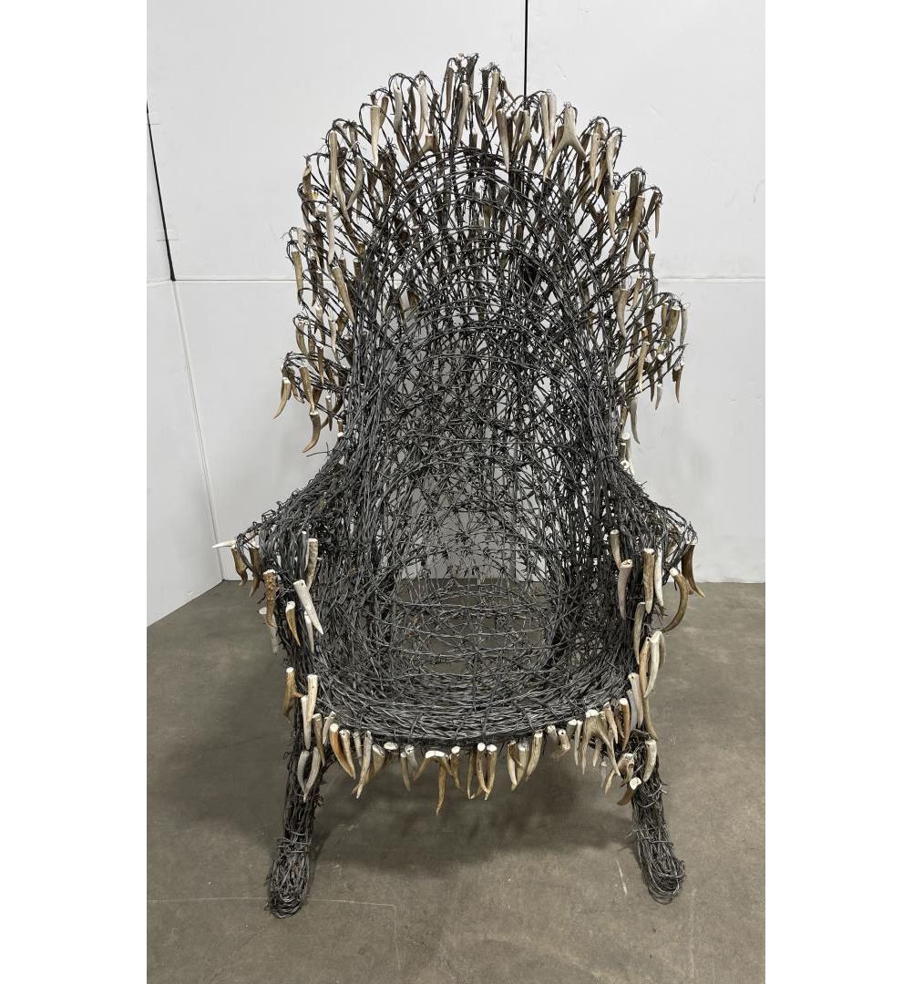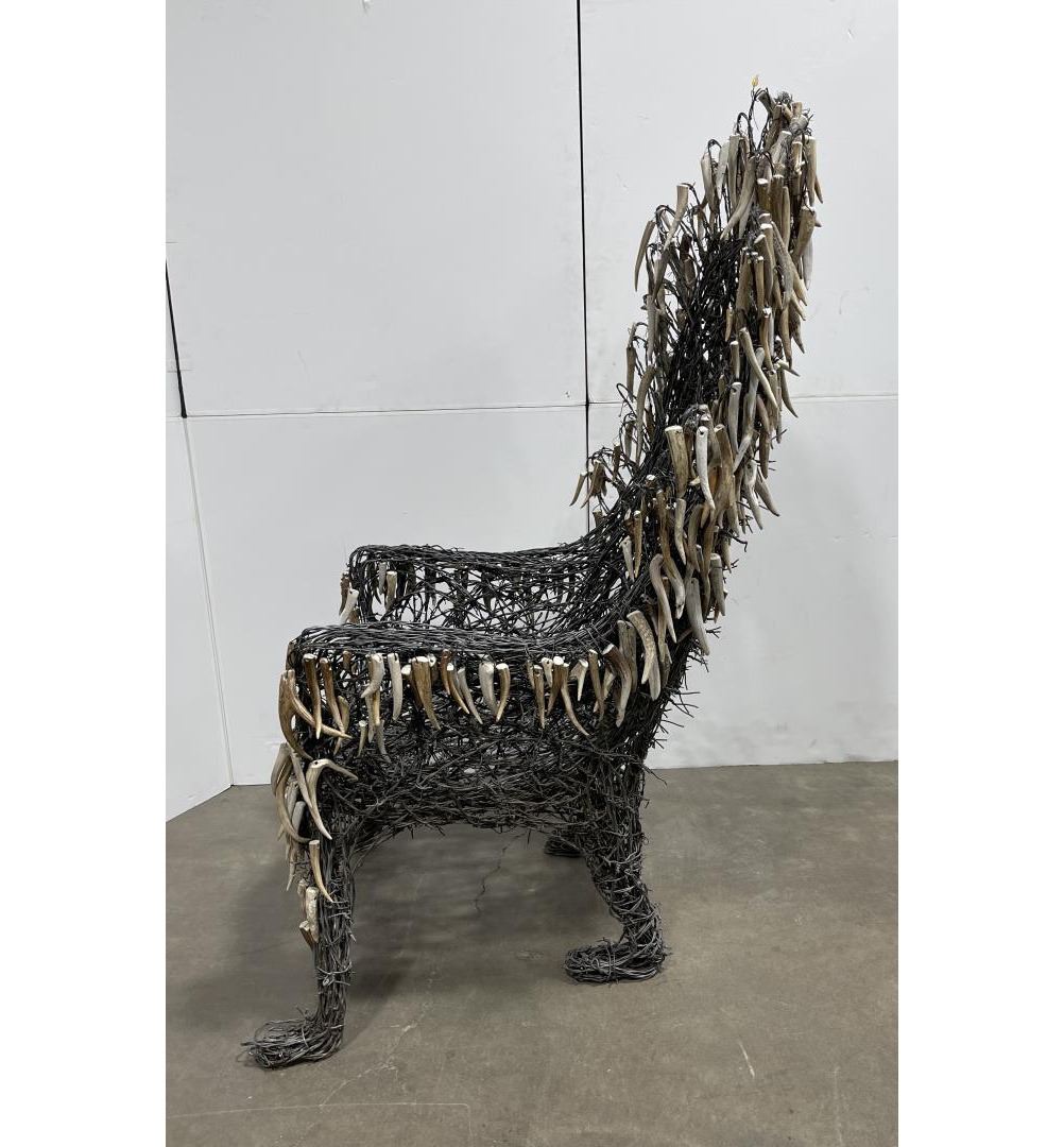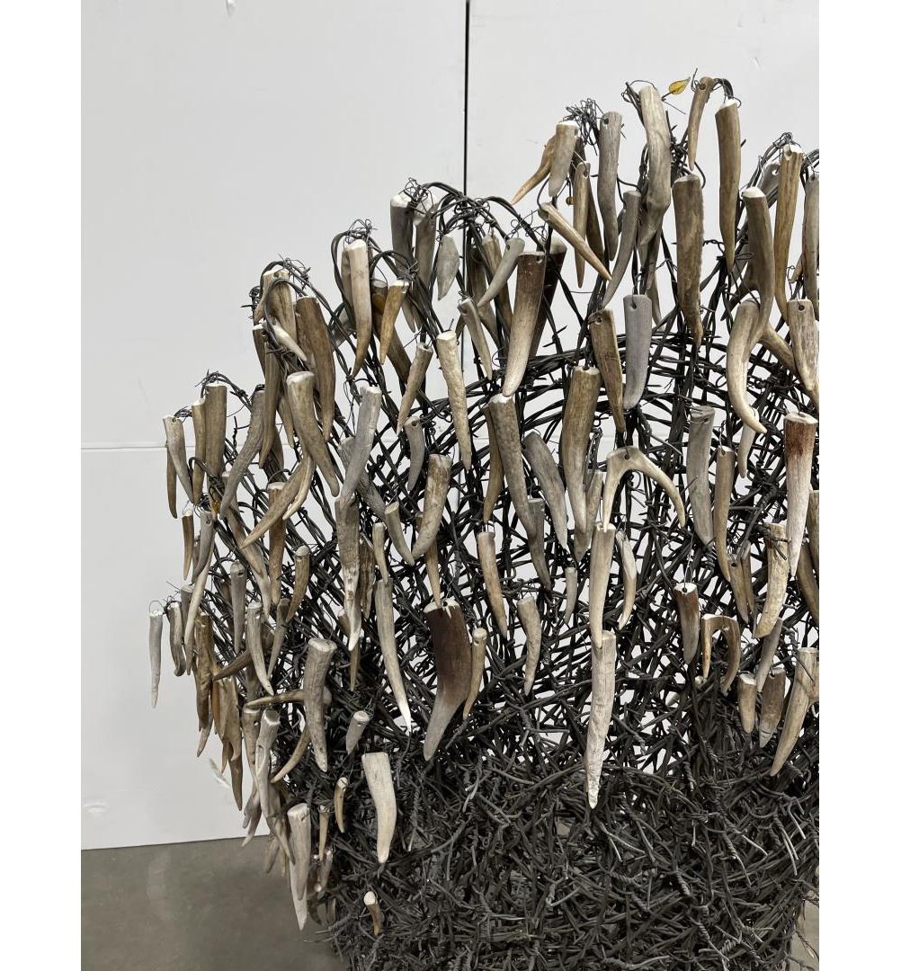 32" by 34" by 59" tall. Fascinating statement piece, lots of movement and sway in the hanging antler pieces. Michael Miller (1959-2021). Adopted at the age of 2 by a Mennonite family, Michael was raised on the Oregon coast. He began woodworking at the age of 14. At age 21, Michael opened his first woodworking shop and made high end cabinetry and fine furniture. Michael's work has been featured at many art shows in California and at the Maritime Museum in Monterey, California. Later moving to Montana, Michael collected everything from wood to spent brass and turned them into masterful works of art.