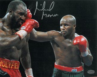 Michael Moorer is one of only four men (the others being Muhammad Ali, Evander Holyfield and Lennox Lewis) to win one or more versions of the world heavyweight championship on three separate occasions, as well as being a former world light-heavyweight champion. He is one of only four men (the others being Bob Fitzsimmons, Michael Spinks and Roy Jones, Jr.) to win world titles at both light-heavyweight and heavyweight. Michael Moorer has hand signed this 8x10 Photo from his fight vs Evander Holyfield on April 22, 1994. Leaf Authentics Hologram and Certificate of Authenticity from Athlon Sports.