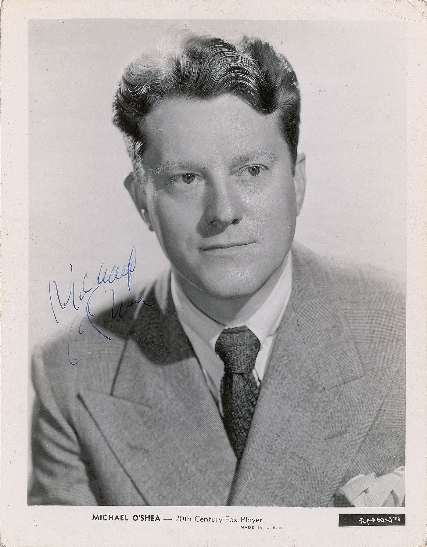 American film and television actor (1906–1973) whose career spanned three decades; he dropped out of school at 12 and began his acting career in vaudeville by touring with boxing idol Jack Johnson's show. Vintage glossy 8 x 10.25 20th Century Fox publicity portrait of O'Shea in a half-length pose, signed in fountain pen. In fine condition.