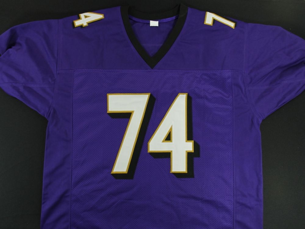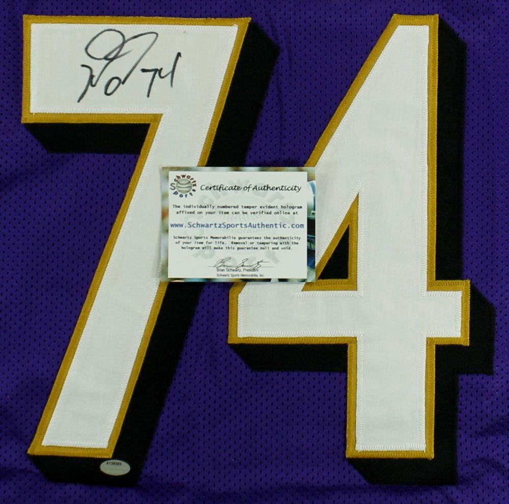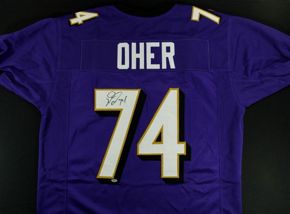 Custom on-field style jersey. Everything sewn on, size L. Hand-signed in black felt tip pen by Michael Oher. The autograph includes an official Schwartz Sports Hologram and matching COA for authenticity purposes.
