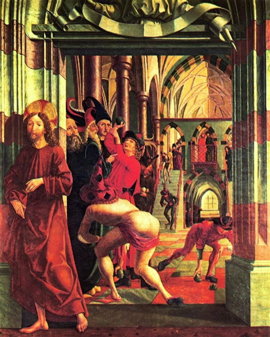 Artist: Michael Pacher - Title: Stoning of Christ - Medium: Fine Art Giclee on Canvas - Image Size: Approximately 20 inches x 16 inches - Unframed on Unstretched Canvas - Biography: Michael Pacher(c. 1435 - August 1498) was a painter and sculptor from Tyrol active during the second half of the fifteenth century. He was one of the earliest artists to introduce the principles of Renaissance painting into Germany. Pacher was a comprehensive artist with a broad range of sculpting, painting, and architecture skills producing works of complex wood and stone. He painted structures for altarpieces on a scale unparalleled in North European art.