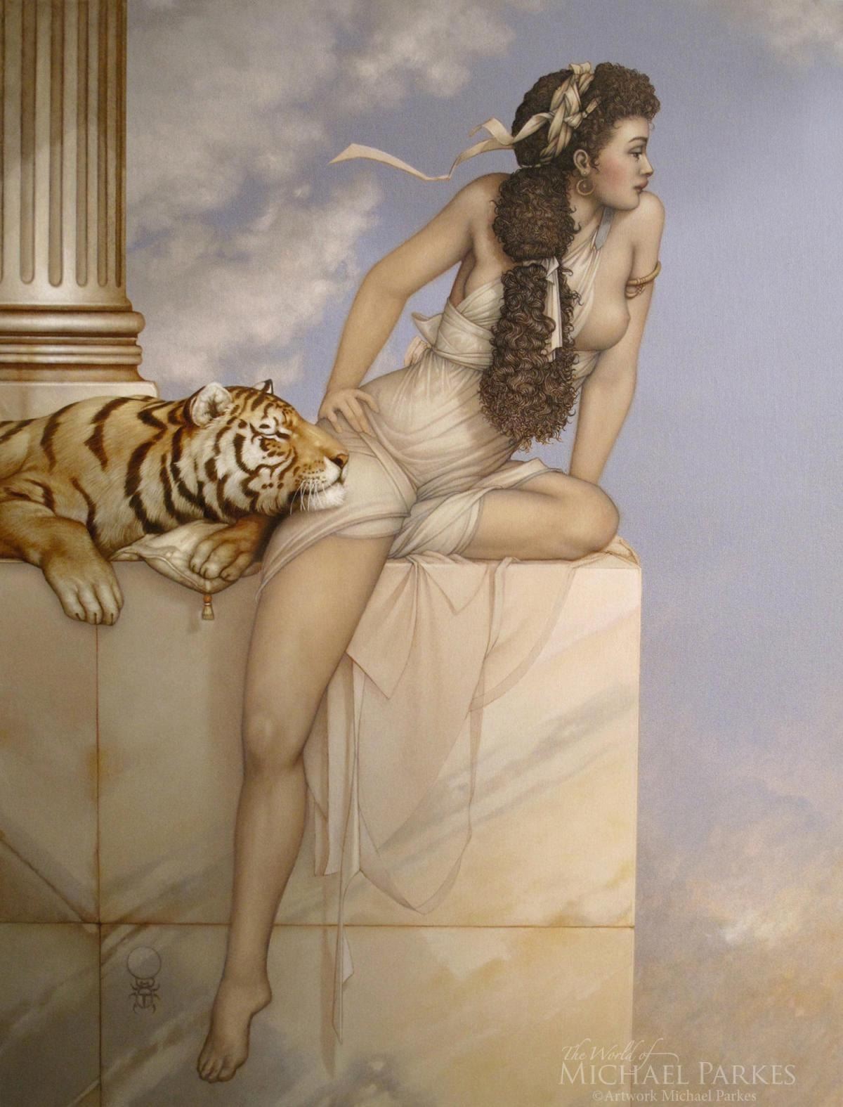 Artist: Michael Parkes. Medium: Masterworks on Canvas. Title: Danae. Size: 35½” x 27½”. 50. THE END OF WAR. Centaurs were the great warriors from the time of the gods. Now, the last centaur, releases his sword and ushers in an age of lasting peace for the earth.