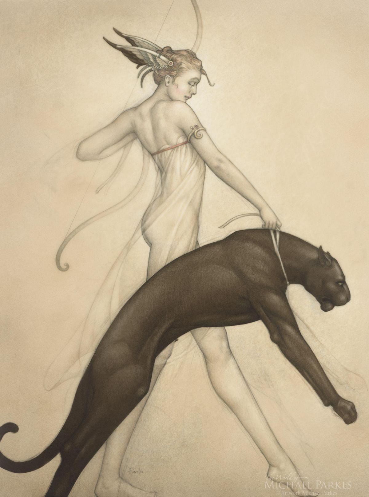 Artist: Michael Parkes. Medium: Masterworks on Paper. Title: Goddess of the Hunt. Size: 23" x 30" inches. Edition: Edition of 120 Printed on German Etching Paper. Certificate of authenticity is included. A note from Michael Parkes—The realm of the gods is eternal. So hunting becomes a strange and wonderful sport. Because nothing ever dies, and there is an eternity of time to play and the hunt could last centuries in earth time. Then all of the players could trade places and the hunt would begin again.